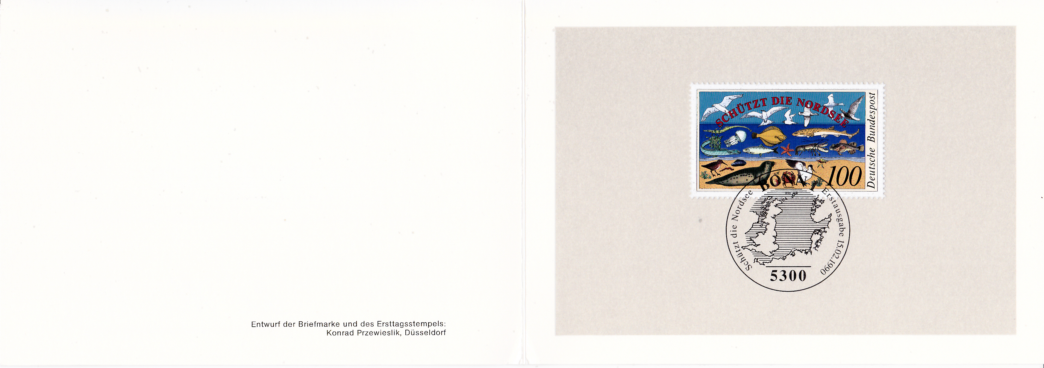 Ministerkarte des Bundesministers für Post und Telekommunikation mit einer Marke (MiNr 1454) "Internationale Nordseeschutz-Konferenz, Den Haag" und dem Ersttagsonderstempel Bonn.