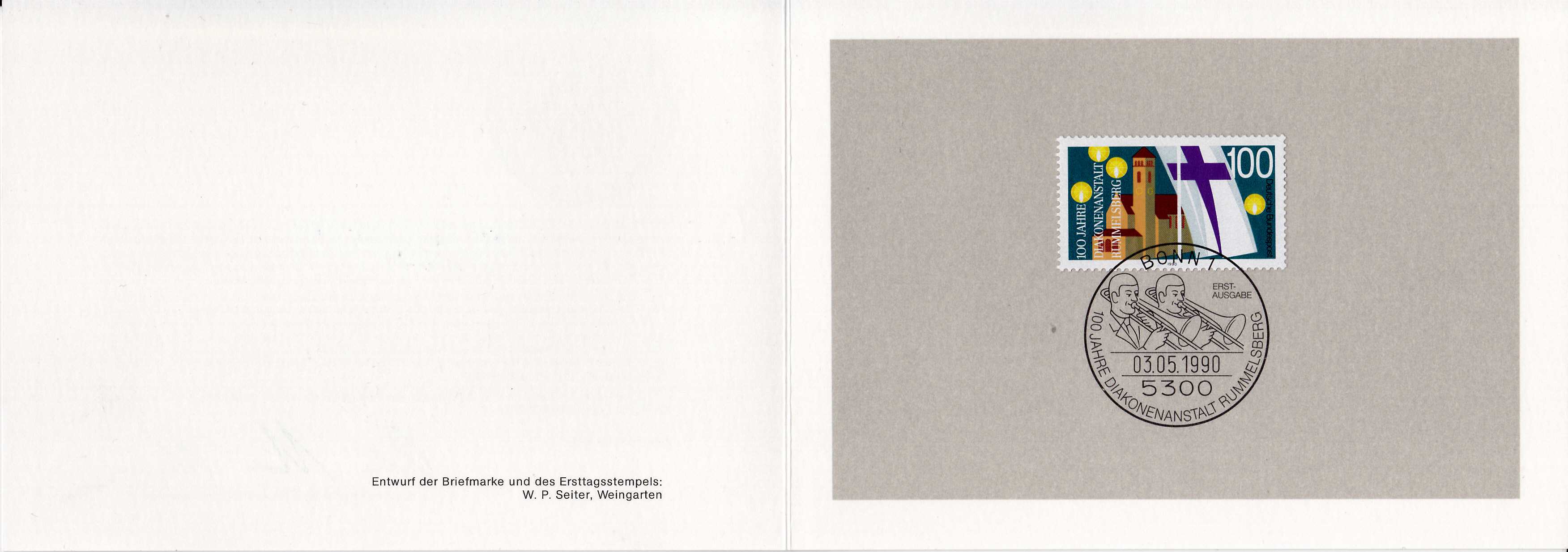 Ministerkarte des Bundesministers für Post und Telekommunikation mit einer Marke (MiNr 1467) "100 Jahre Diakonenanstalt Rummelsberg" und dem Ersttagsonderstempel Bonn.