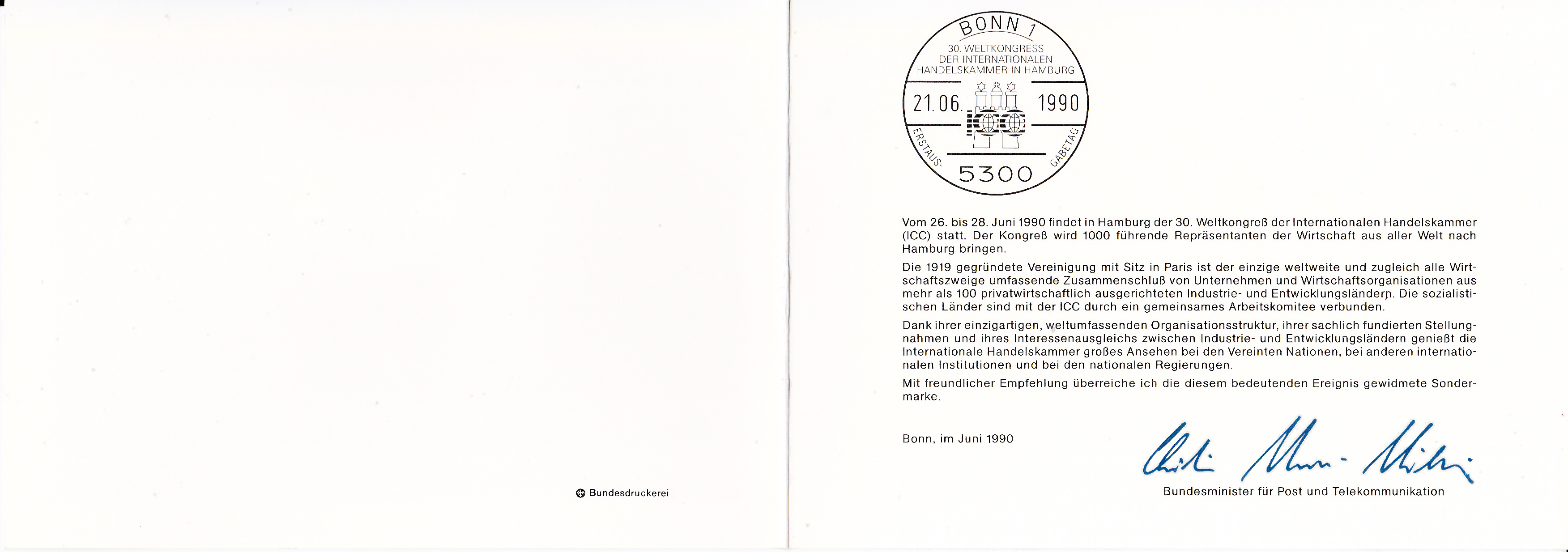 Ministerkarte des Bundesministers für Post und Telekommunikation mit einer Marke (MiNr 1471) "30. Weltkongress der Internationalen Handelskammer (IHK) in Hamburg" und dem Ersttagsonderstempel Bonn.