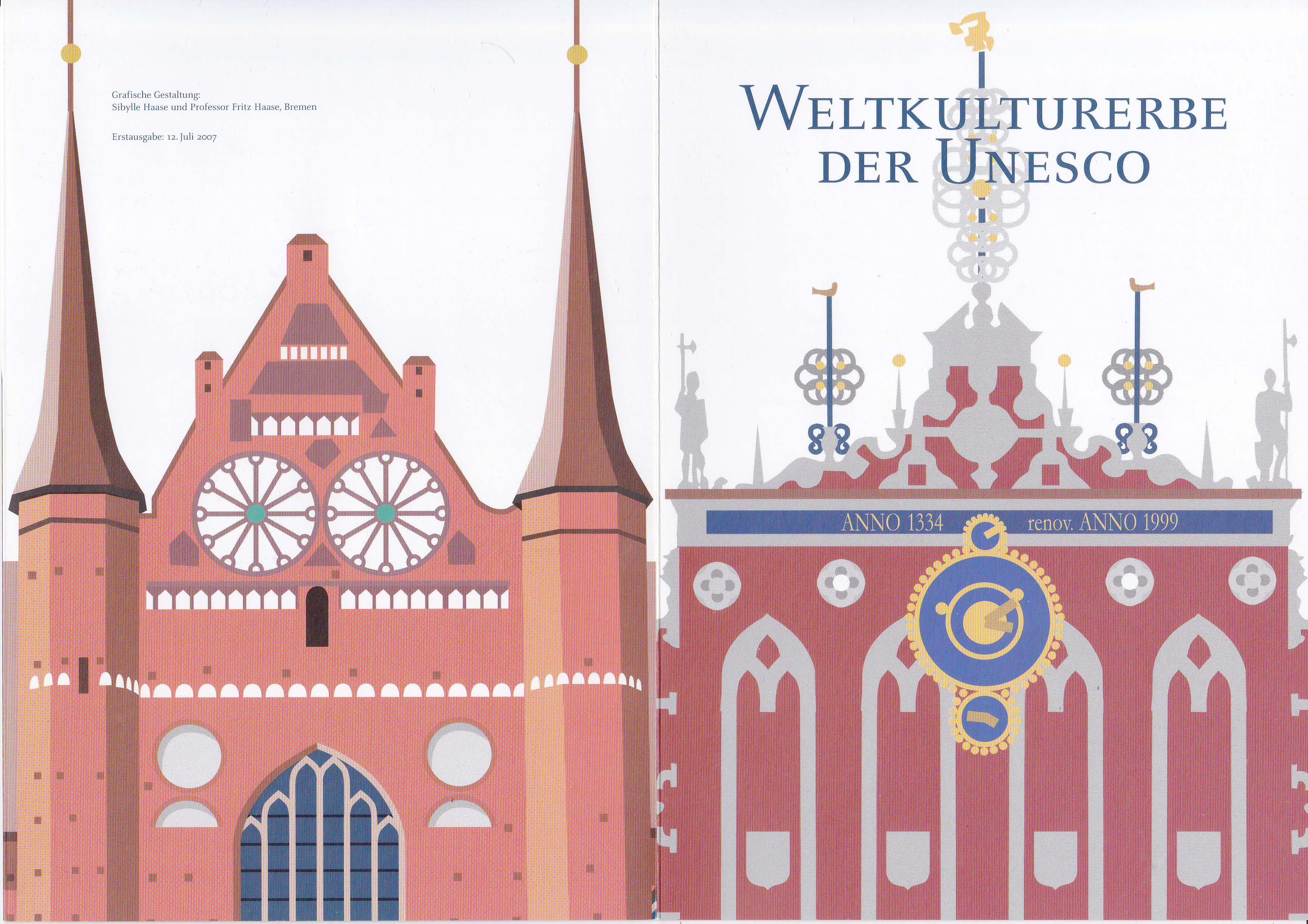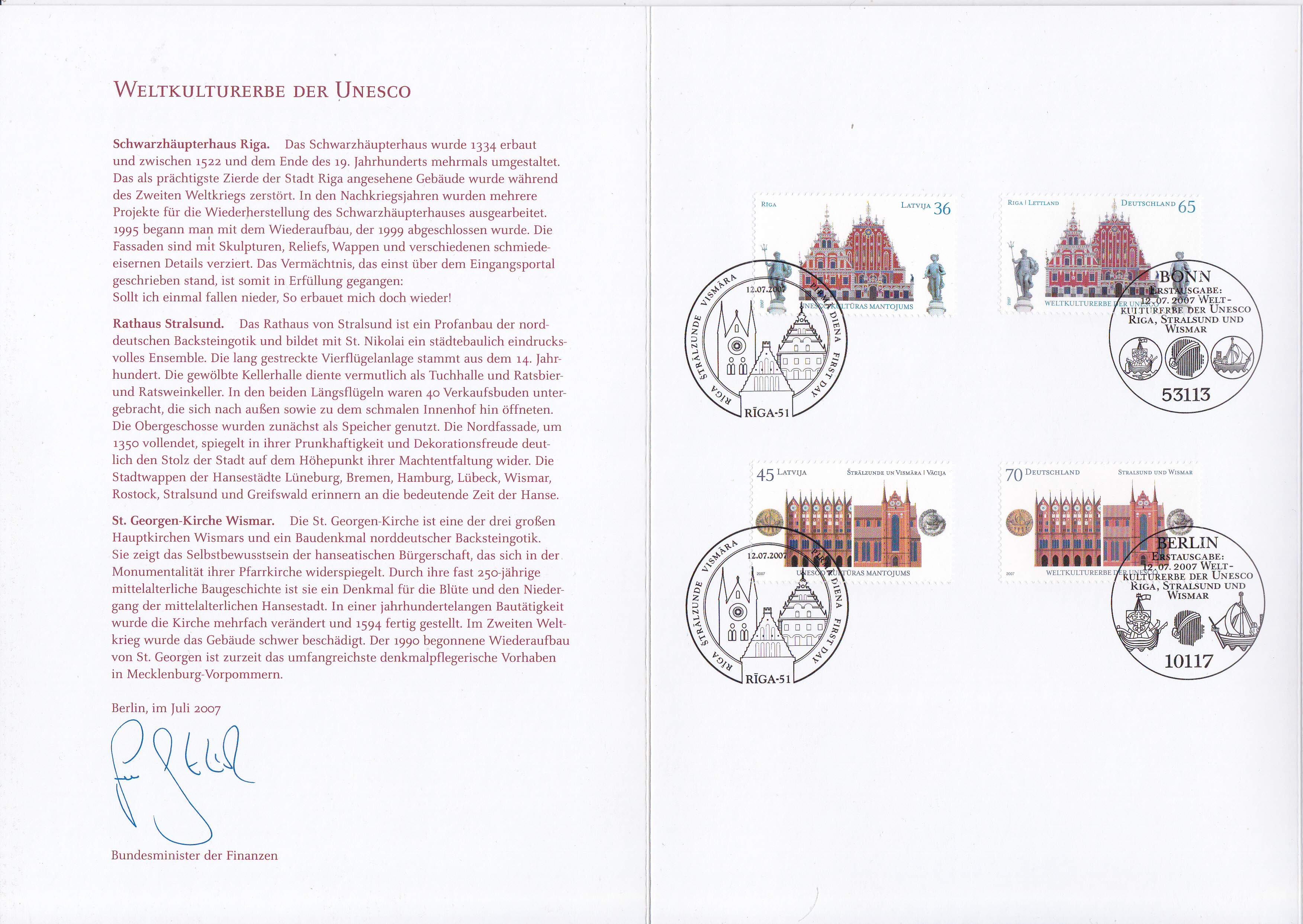 Farbige Ministerkarte mit je einer Marke "UNESCO-Welterbe" Altstädte von Stralsund und Wismar (Bund MiNr 2615 und 2616, Lettland MiNr 702 und 703) und den jeweiligen Ersttagsonderstempel Bonn, Berlin und Riga.