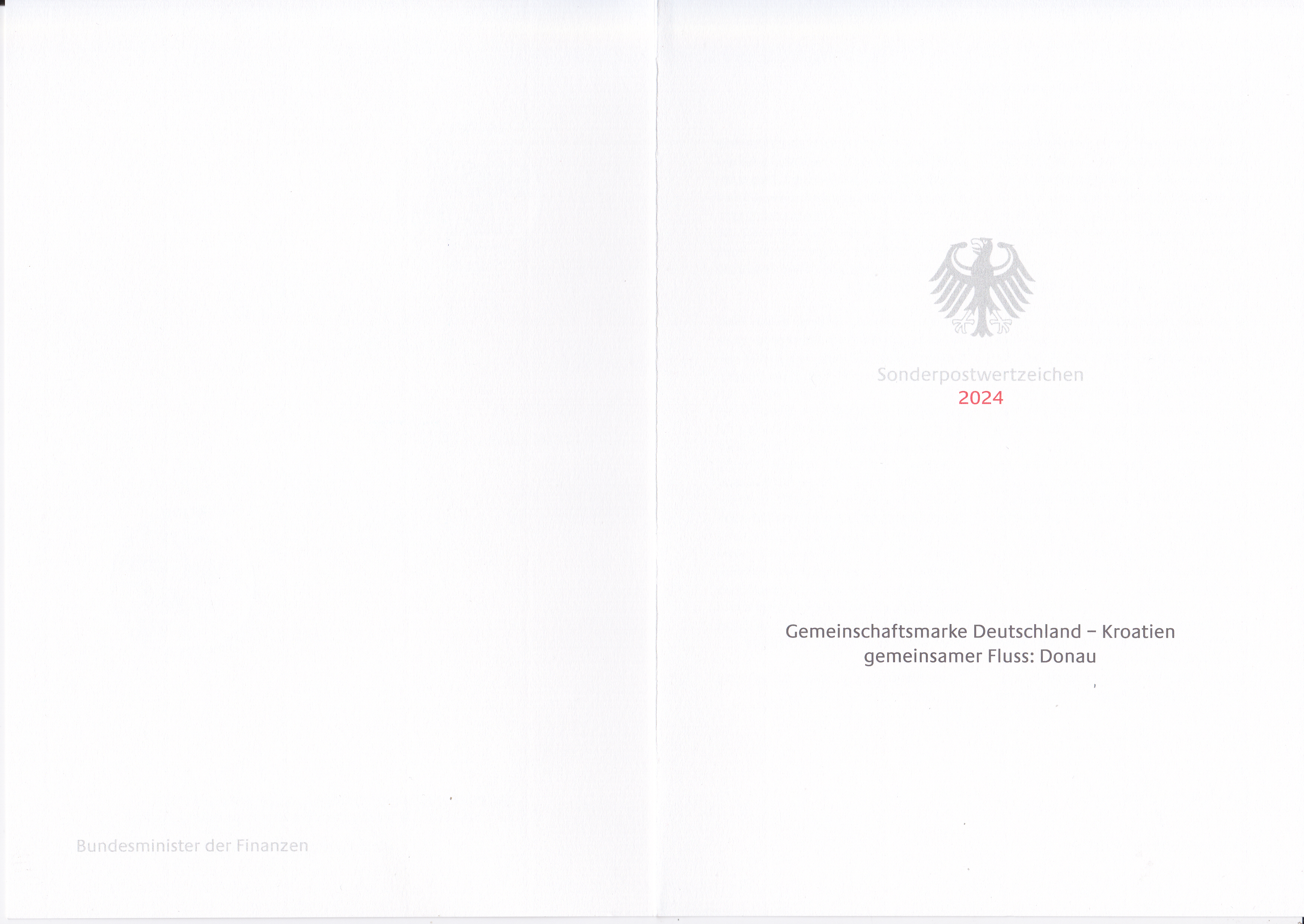 Farbige Ministerkarte mit je einer Marke "Donau, verbindender Fluss zwischen Deutschland und Kroatien" (Bund MiNr 3858 und Kroatien MiNr ??) und den jeweiligen Ersttagsonderstempel Berlin und Zagreb.