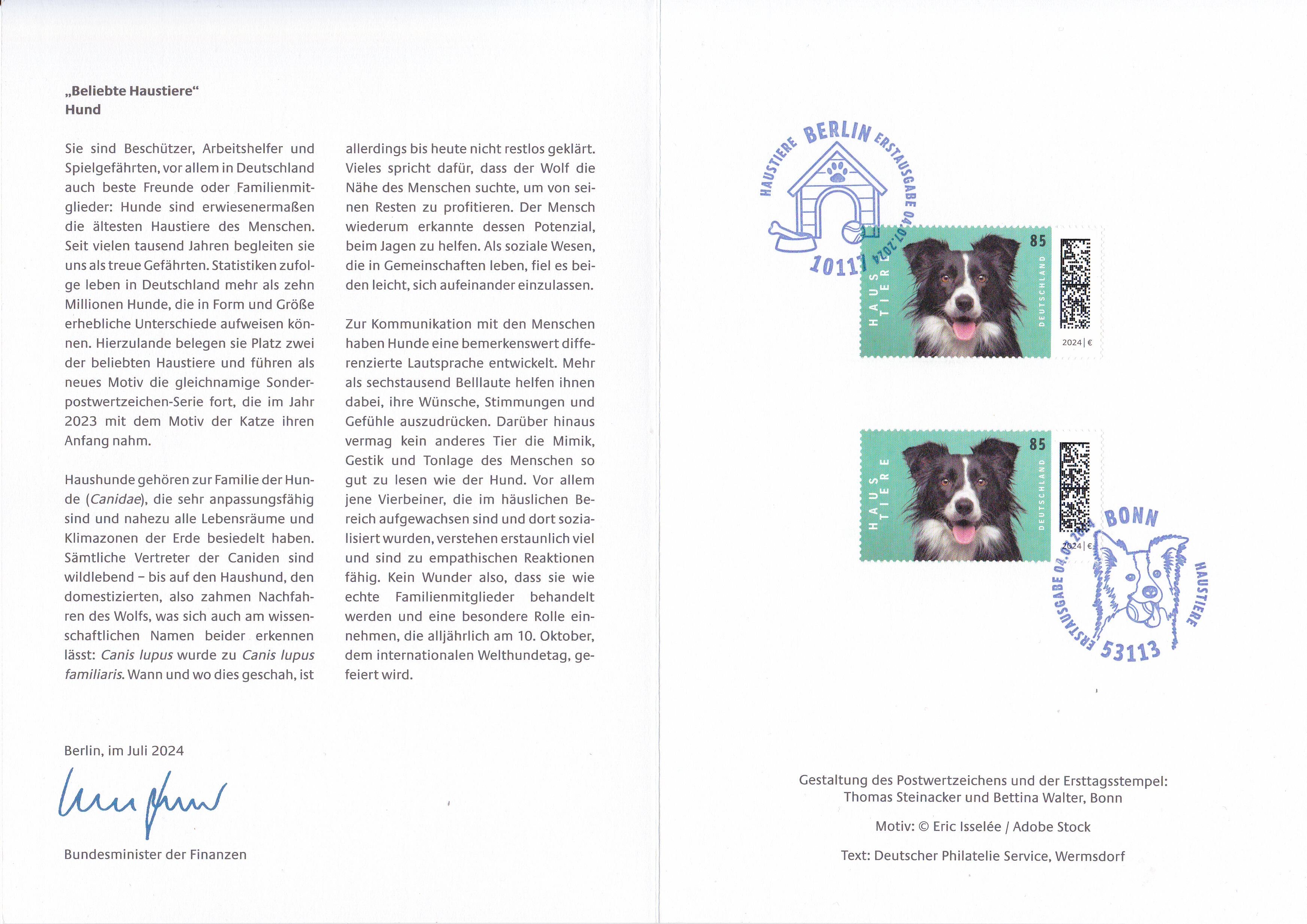 Ministerkarte des Bundesministers für Finanzen mit zwei Marken mit dem Motiv "Border Collie (Canis lupus familiaris)" aus der Serie "Haustiere" (MiNr 3837) und den beiden Ersttagsonderstempel Bonn und Berlin.