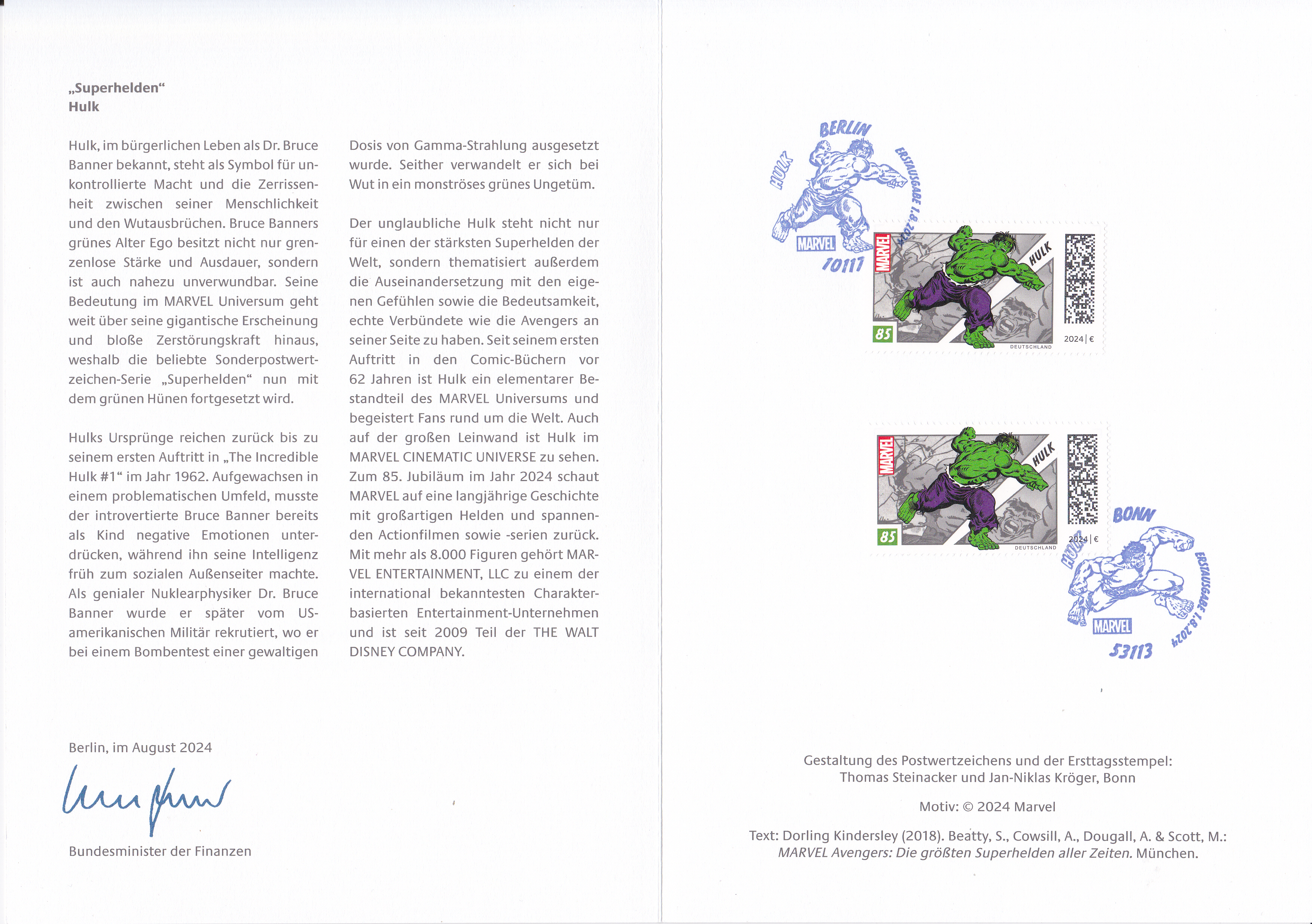 Ministerkarte des Bundesministers für Finanzen mit zwei Marken mit dem Motiv "Der unglaubliche Hulk" aus der Serie "Superhelden" (MiNr 3847) und den beiden Ersttagsonderstempel Bonn und Berlin.