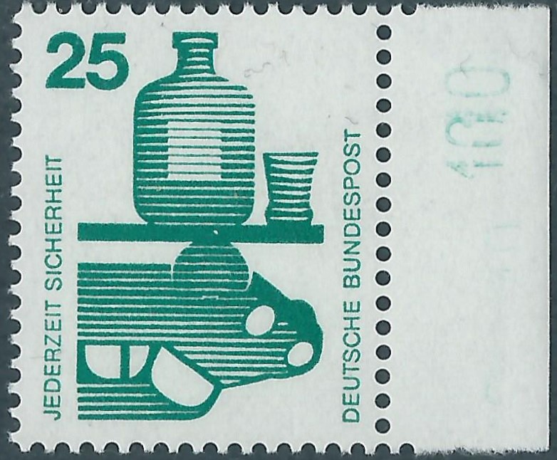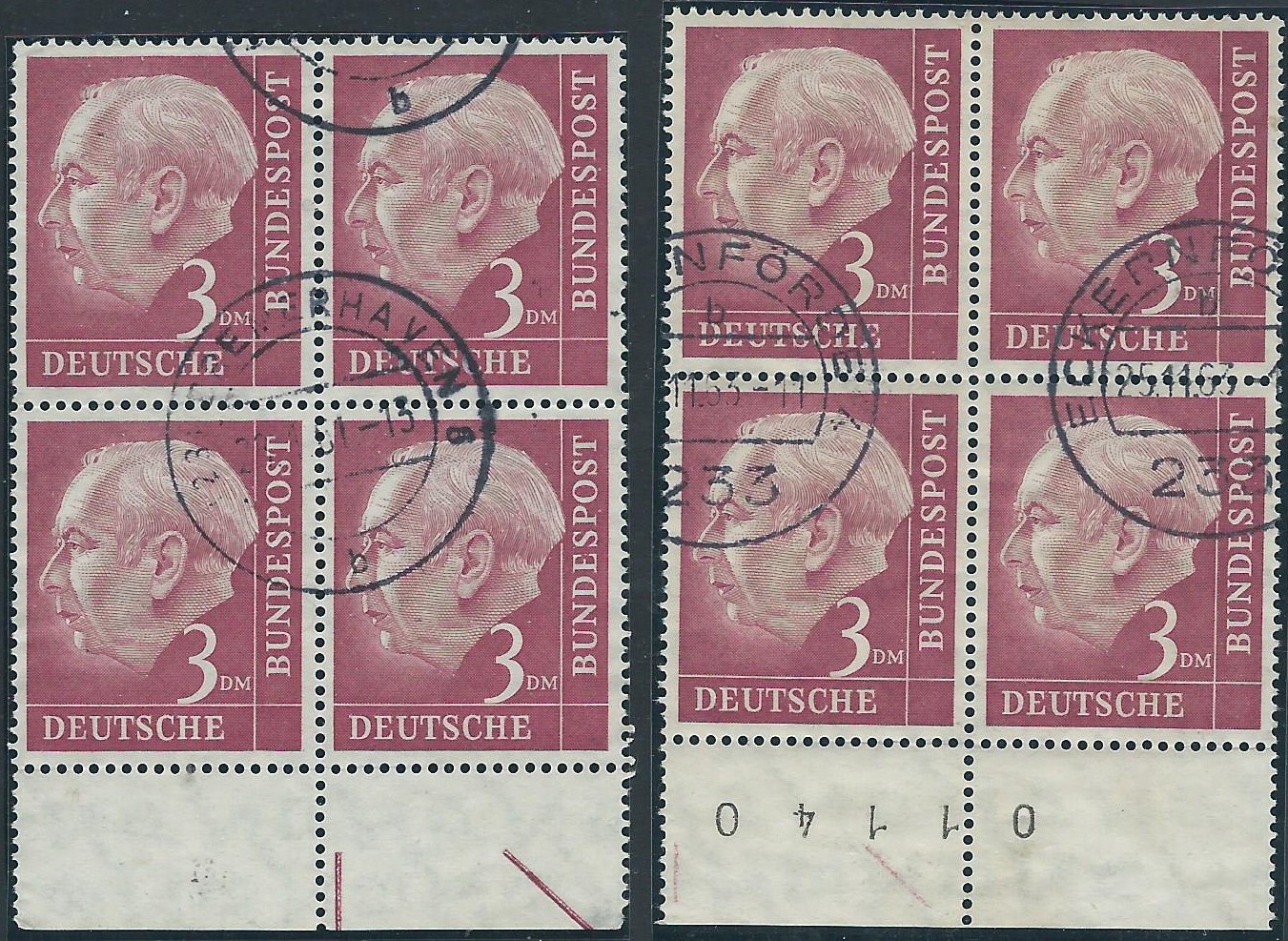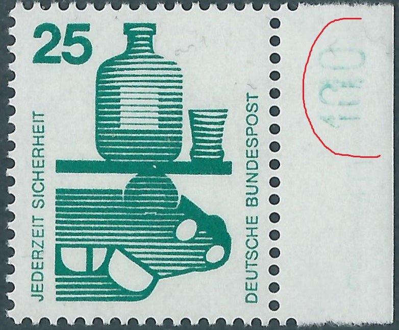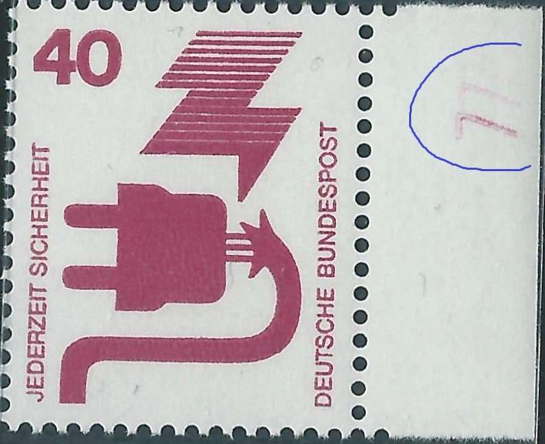 Auch von anderen Bogenrandzudrucken gibt es Abklatsche. Da ist zum einen der Steuerstrich. Der ist auch immer in Markenfarbe gehalten. Ein besonders gutes Beispiel kann ich an Hand der Heuss I 3 DM-Marke zeigen.
