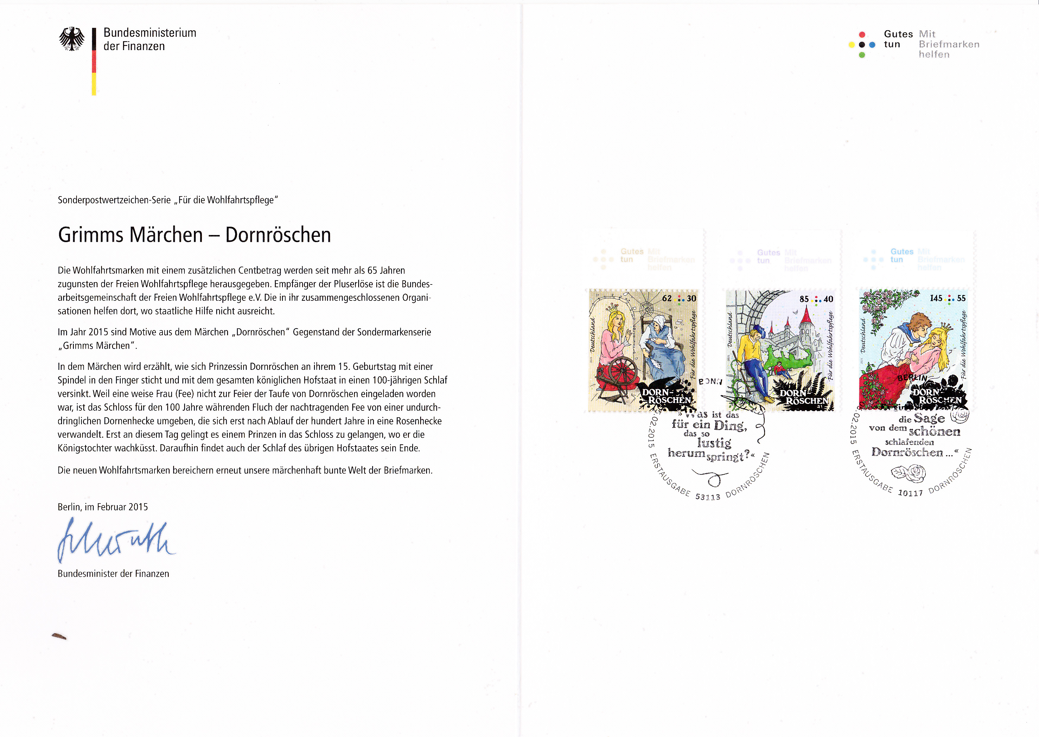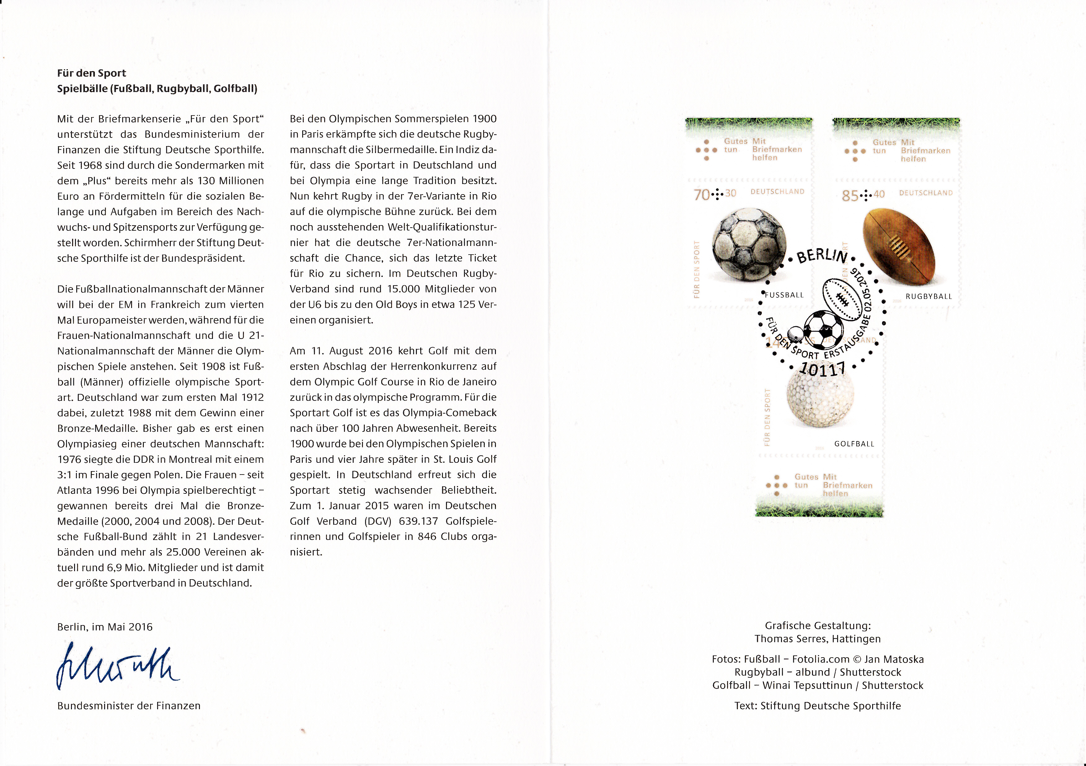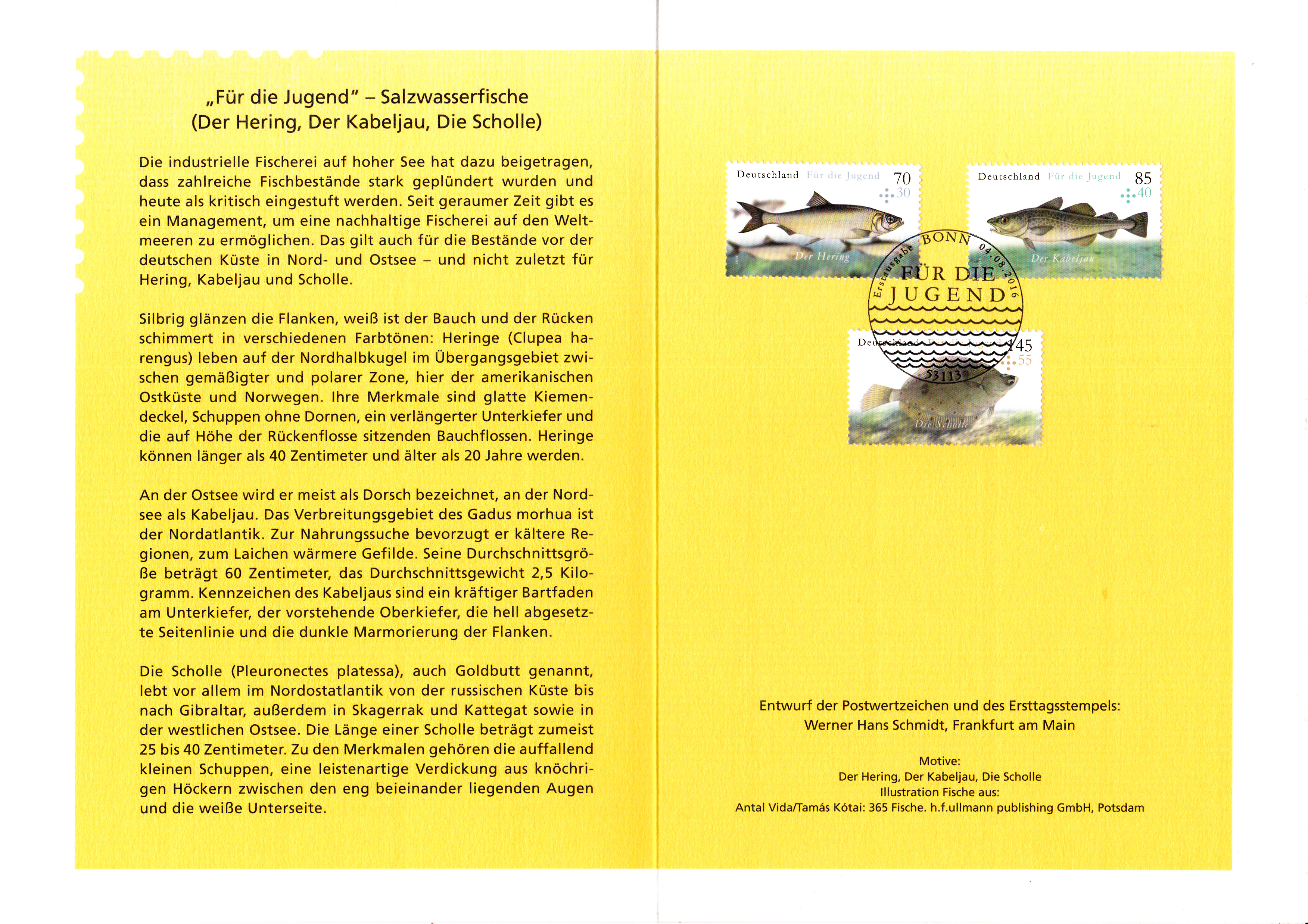 Hier wieder eine der mehrfarbigen Ministerkarten, die es immer zu Markenübergaben durch den Finanzminister gibt. Dies Karte enthält die Jugendmarken 2016 mit den Salzwasserfischen. Zwei Marken sind wie üblich mit dem Ersttagsonderstempel Berlin und eine Marke mit dem aus Bonn gestempelt.
