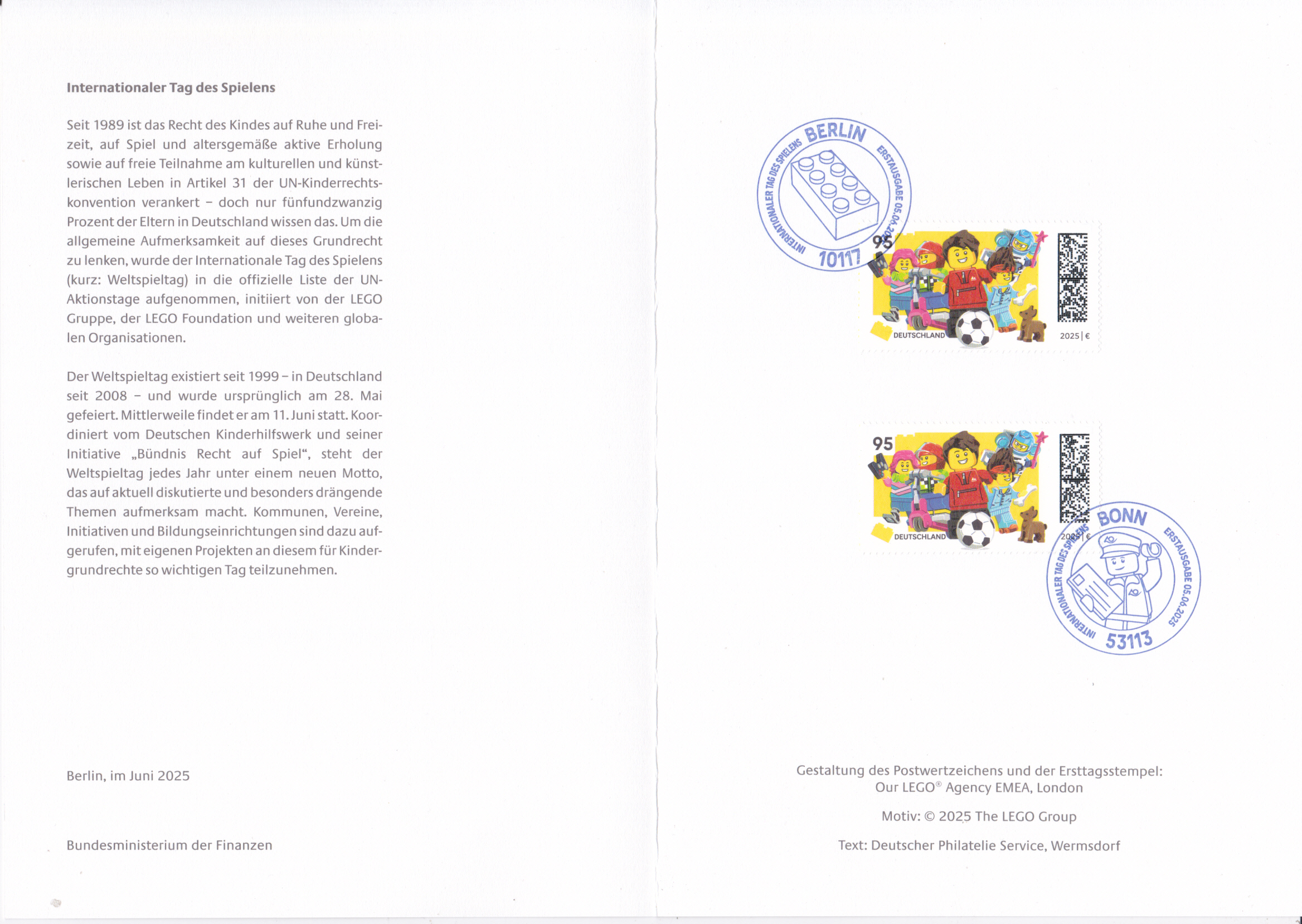Ministerkarte des Bundesministers für Finanzen mit zwei Marken "Internationaler Tag des Spielens: LEGO" (MiNr 3912) mit den beiden Ersttagsonderstempel Bonn und Berlin.