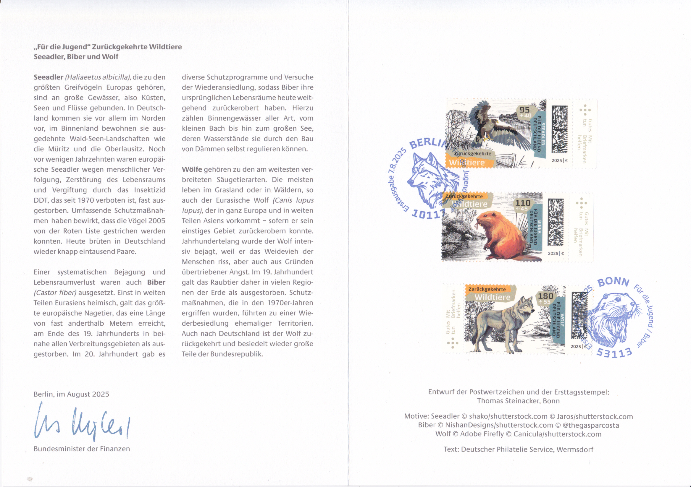 Ministerkarte des Bundesministers für Finanzen mit je einer Marke der Jugendmarken 2025 (MiNr 3918-3920) mit Motiven zum Thema "Zurückgekehrte Wildtiere" und den beiden Ersttagsonderstempel Bonn und Berlin.