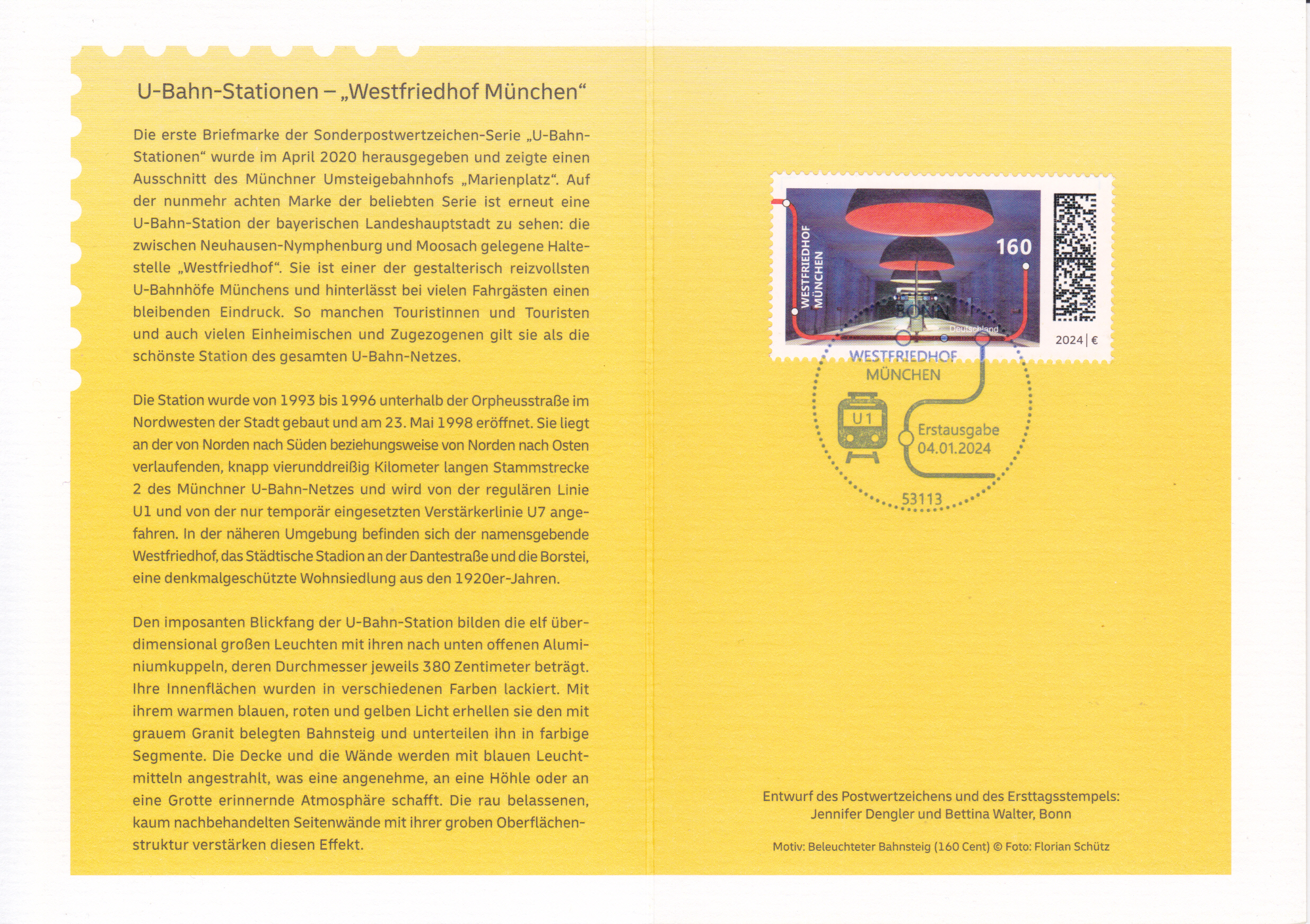 Klappkarte des Vorstandsvorsitzenden der Deutschen Post AG mit der Marke (MiNr 3807) zu 160 Cent mit dem Motiv "U-Bahn-Haltestelle Westfriedhof in München" aus der Serie "U-Bahn-Stationen" und dem Ersttagsonderstempel Bonn.