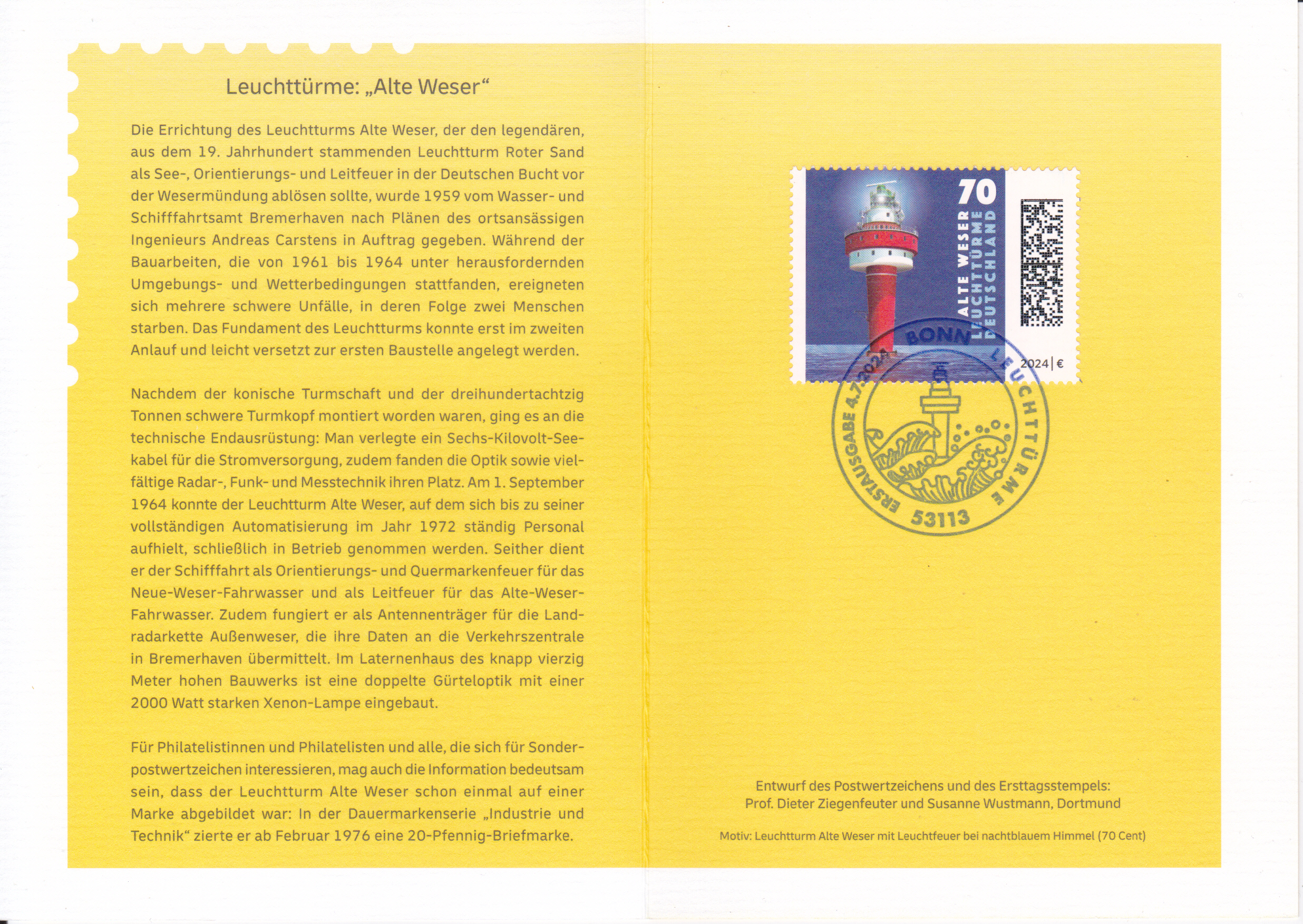 Klappkarte des Vorstandsvorsitzenden der Deutschen Post AG mit der Marke (MiNr 3840) mit dem Leuchtturm "Alte Weser" und dem Ersttagsonderstempel Bonn.