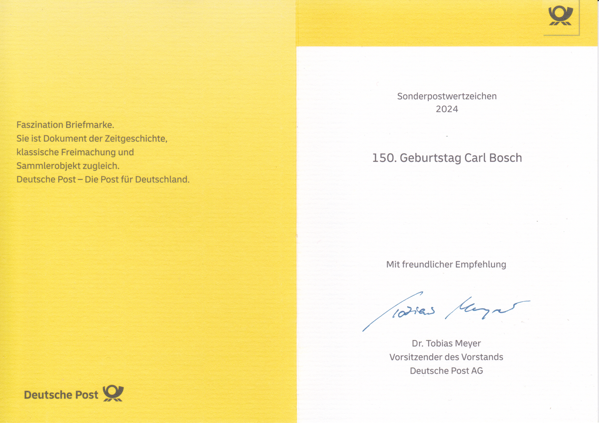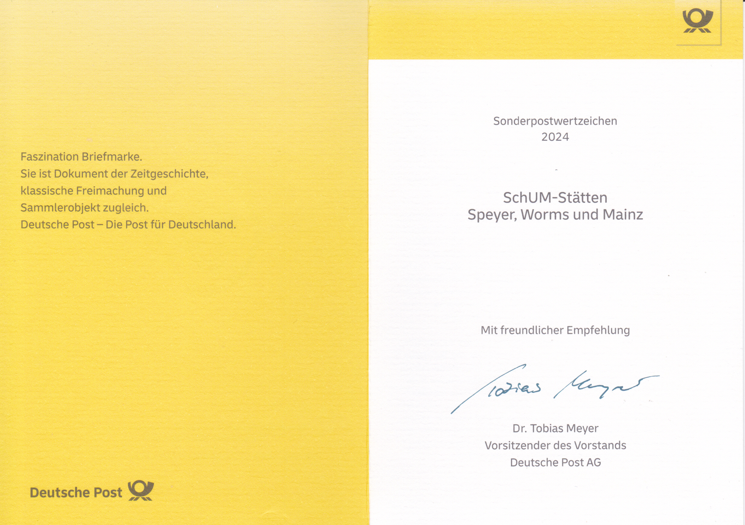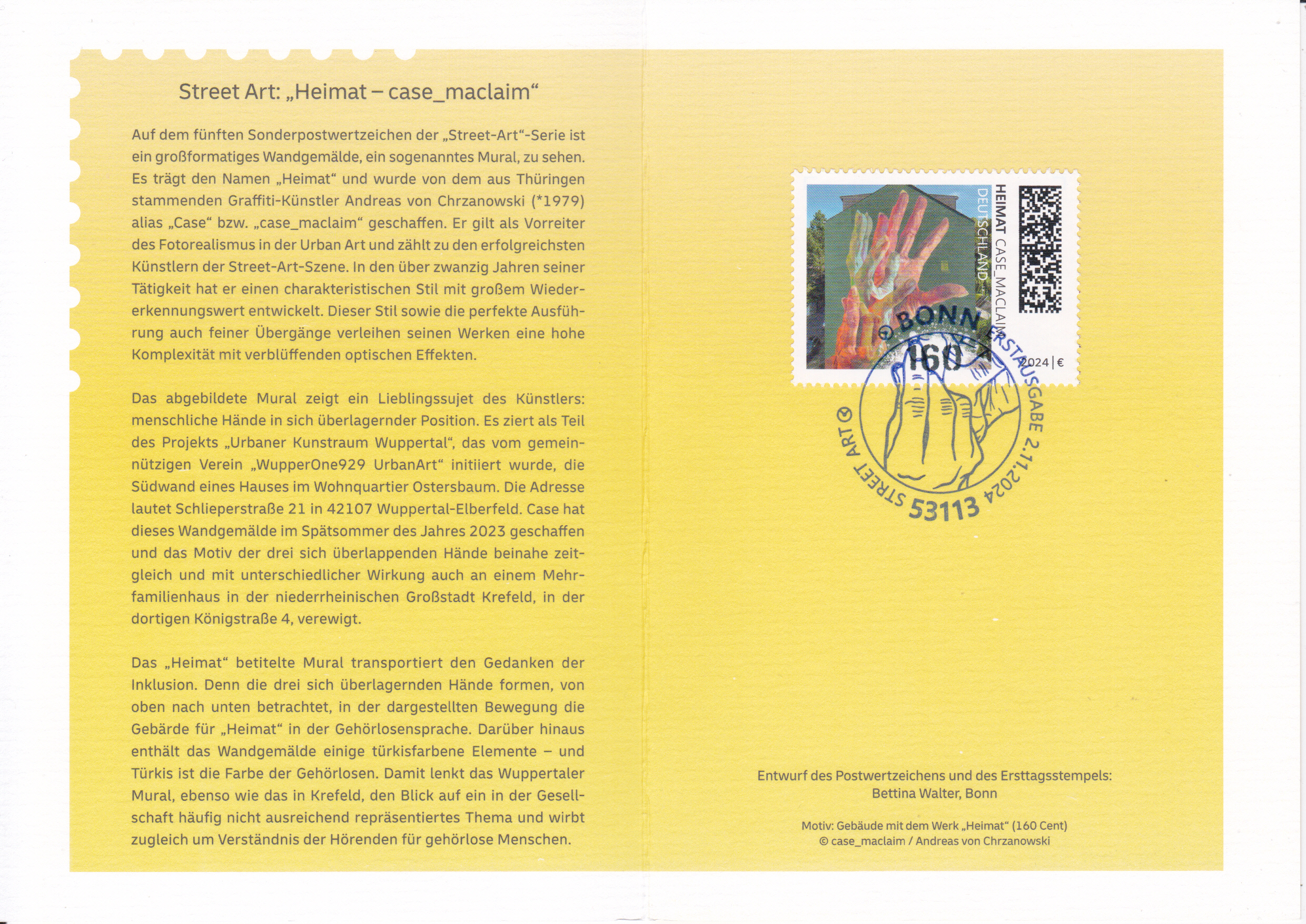 Klappkarte des Vorstandsvorsitzenden der Deutschen Post AG mit der Marke (MiNr 3864) mit der Wandmalerei "Heimat" von Andreas von Chrzanowski (geb. 1979; alias "Case Maclaim", deutscher Graffiti-Künstler) aus der Serie "Street Art" und dem Ersttagsonderstempel Bonn.