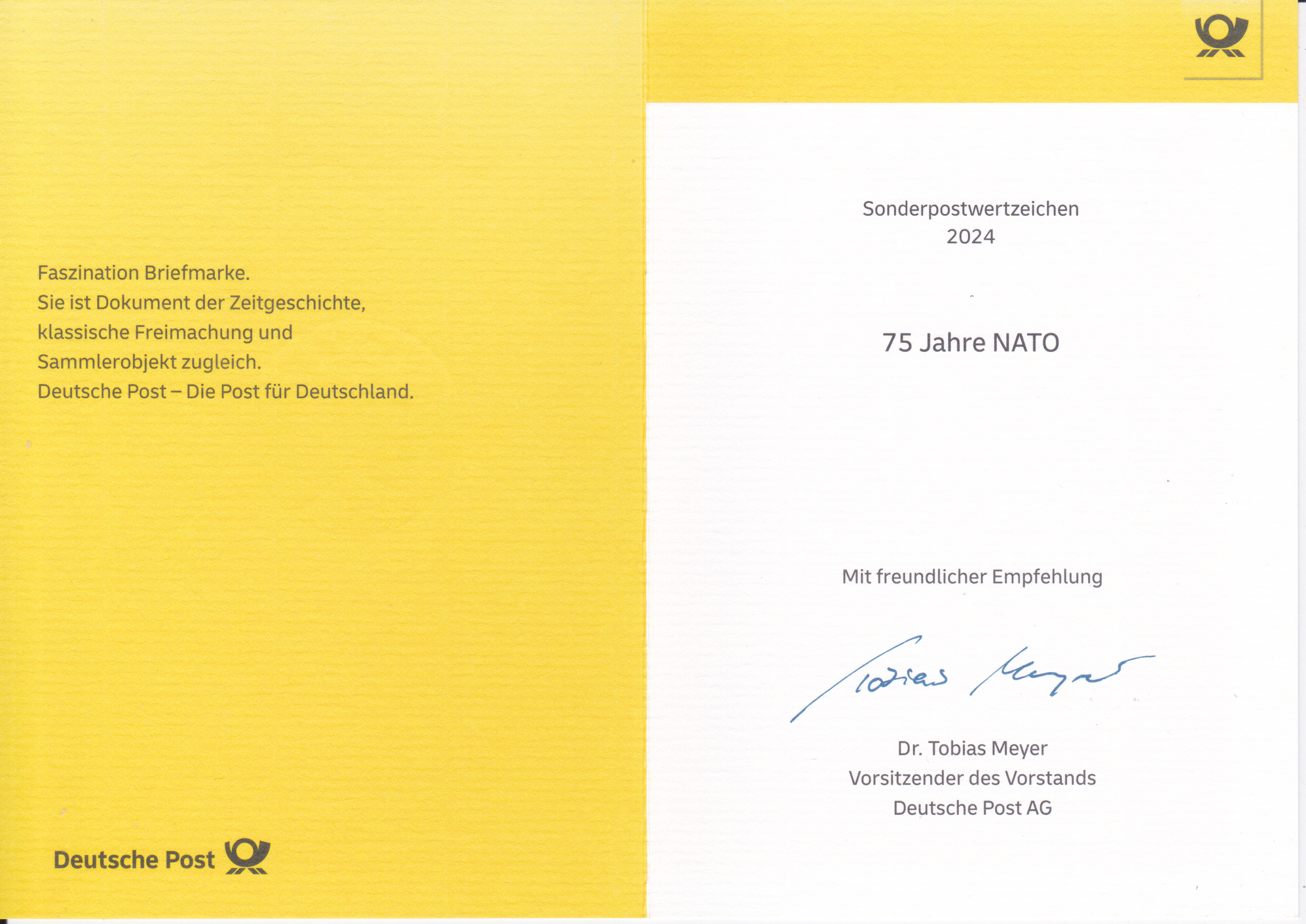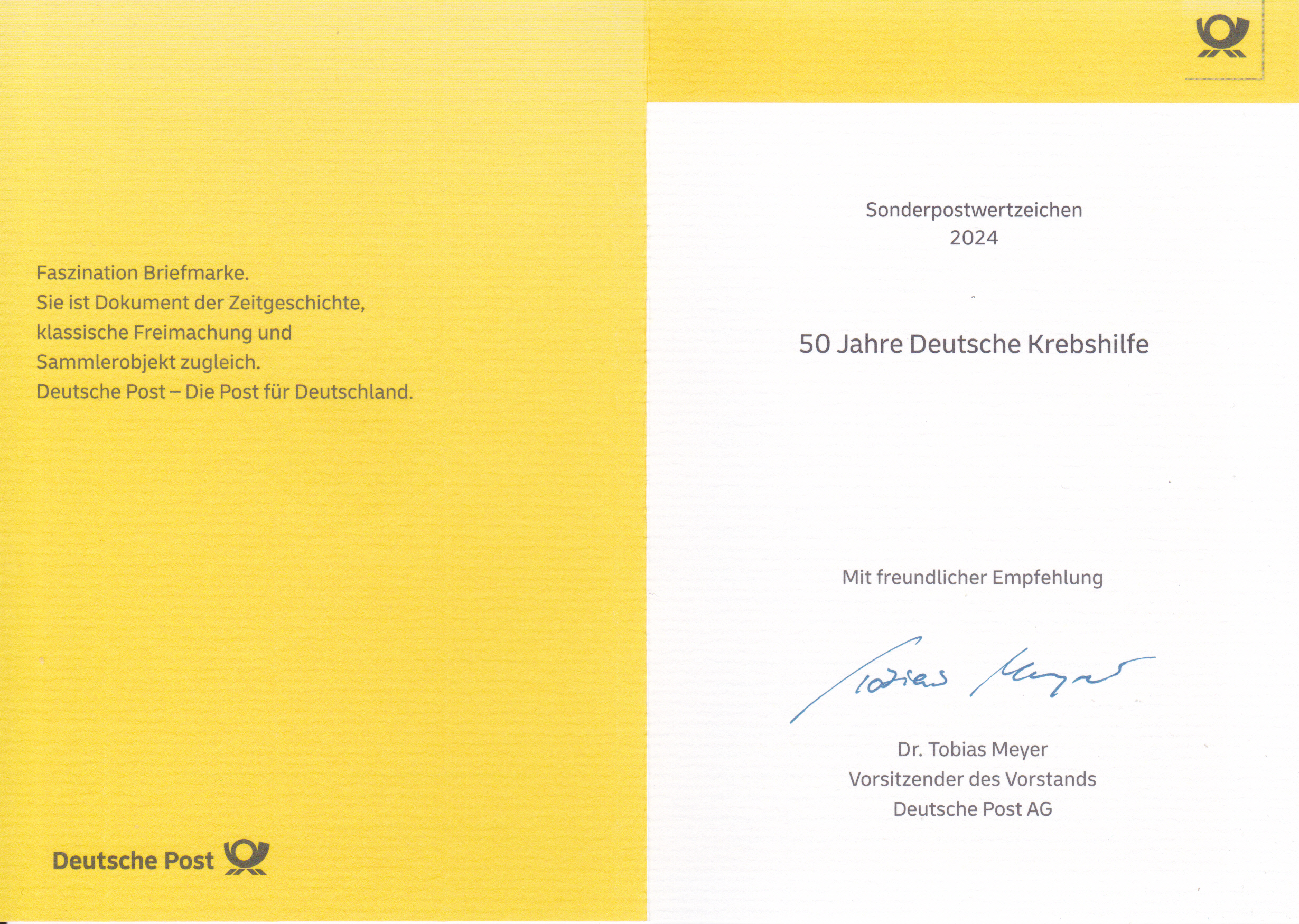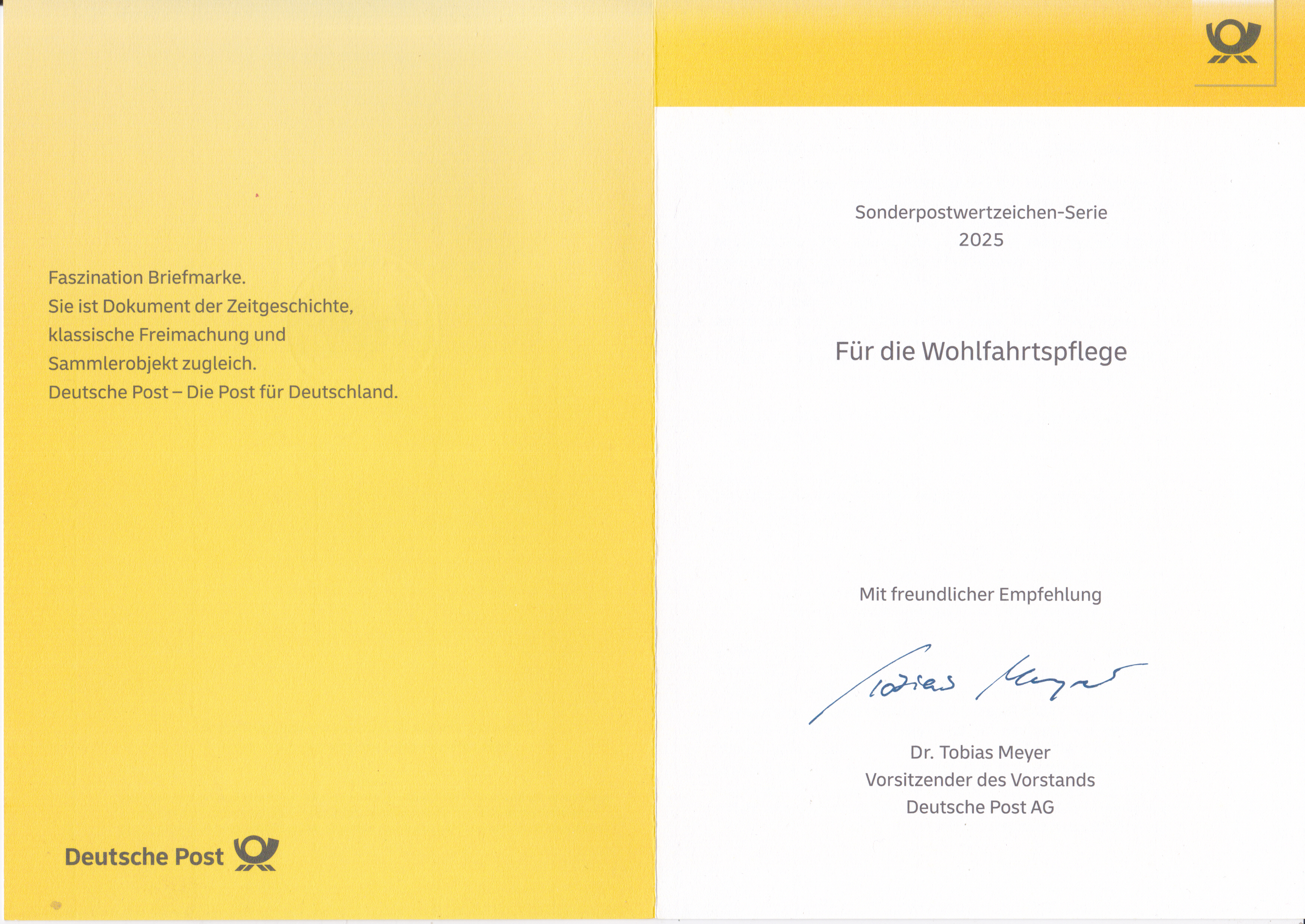 Klappkarte des Vorstandsvorsitzenden der Deutschen Post AG mit den Marken (MiNr 3875) zu 125 Cent mit dem Motiv "Burg, gebildet aus Briefumschlag, Federhaltern, Stiftebecher und Briefmarken" und (MiNr 3876) zu 290 Cent dem Motiv "Surferin auf Brett mit Briefsegel" aus der Dauerserie "Welt der Briefe" und dem Ersttagsonderstempel Bonn.