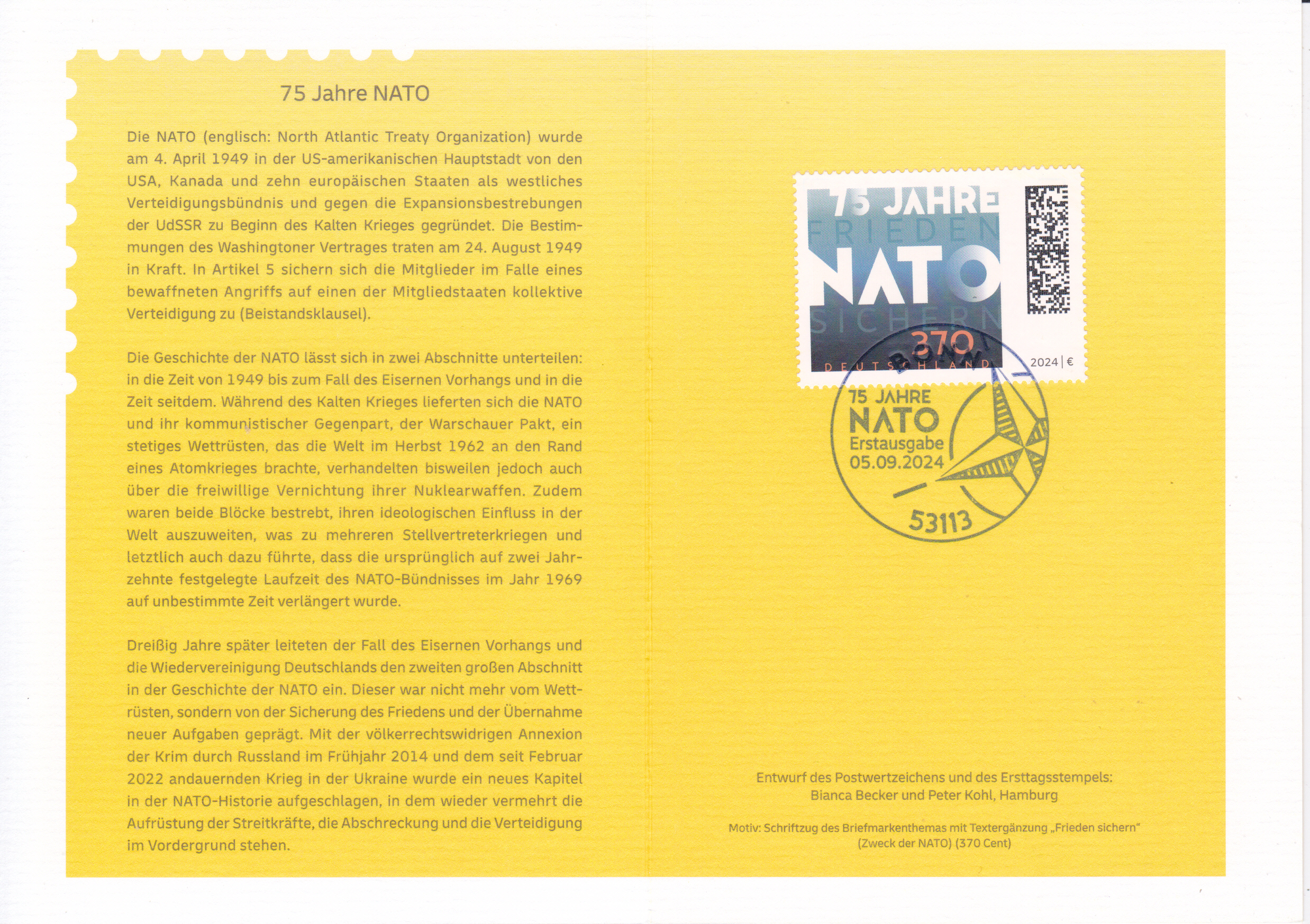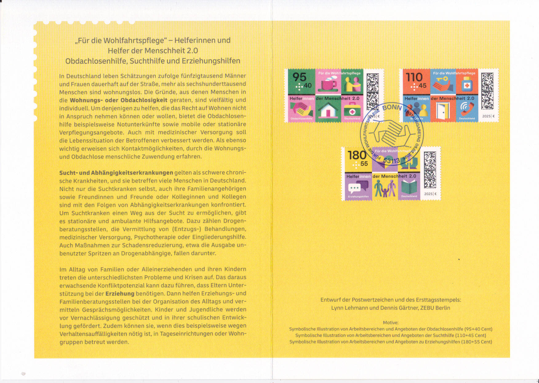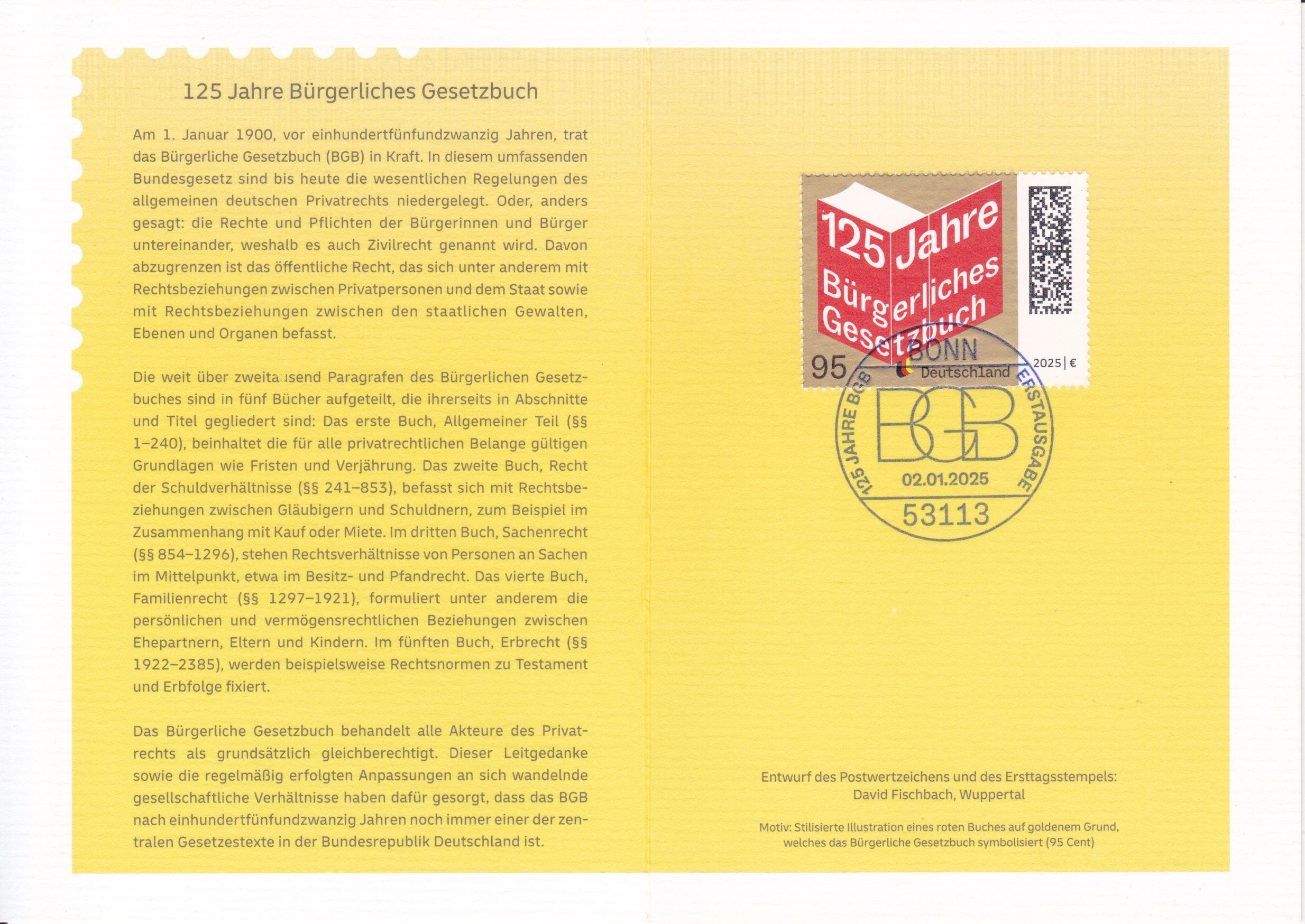 Klappkarte des Vorstandsvorsitzenden der Deutschen Post AG mit den Marken (MiNr 3875) zu 125 Cent mit dem Motiv "Burg, gebildet aus Briefumschlag, Federhaltern, Stiftebecher und Briefmarken" und (MiNr 3876) zu 290 Cent dem Motiv "Surferin auf Brett mit Briefsegel" aus der Dauerserie "Welt der Briefe" und dem Ersttagsonderstempel Bonn.