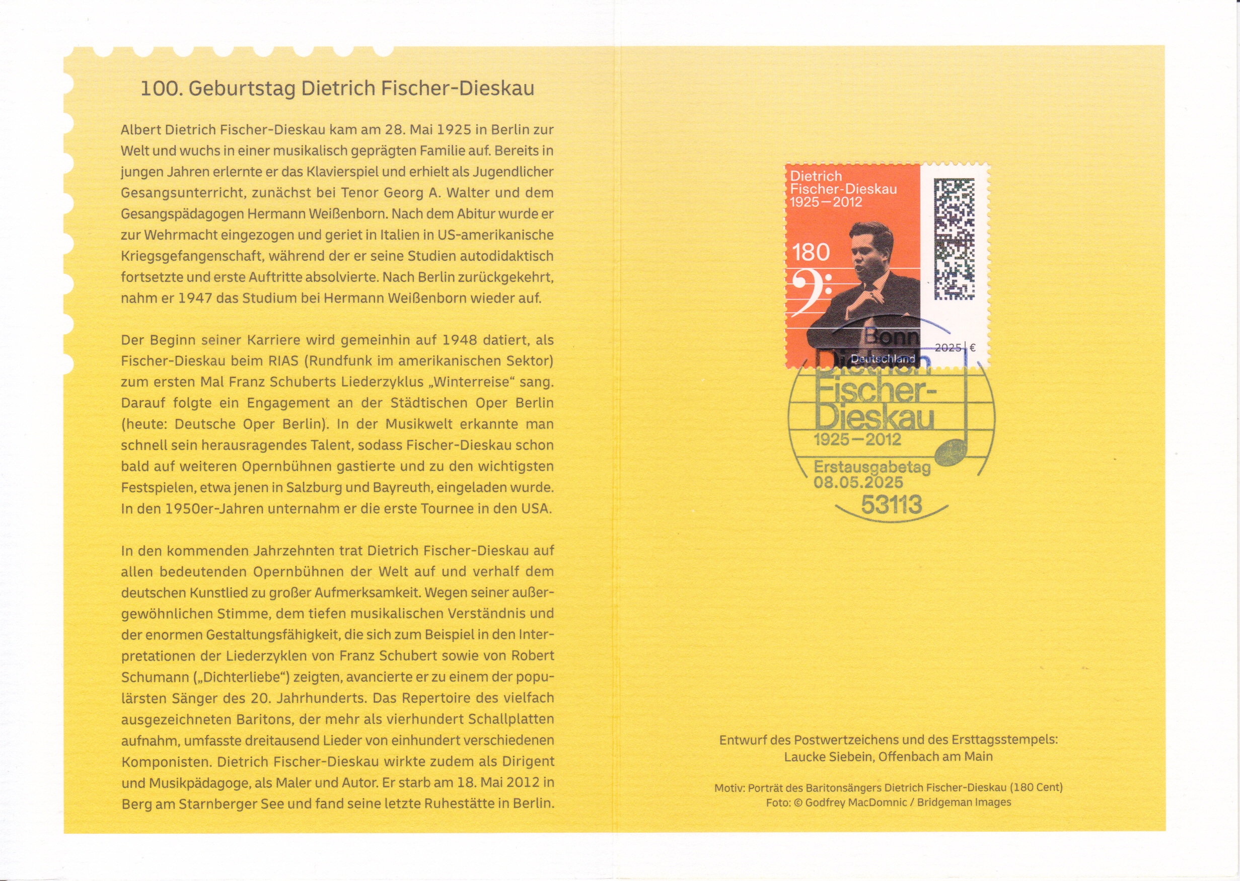 Klappkarte des Vorstandsvorsitzenden der Deutschen Post AG mit der Marke (MiNr 3908) zum 100. Geburtstag von Dietrich Fischer-Dieskau und dem Ersttagsonderstempel Bonn.