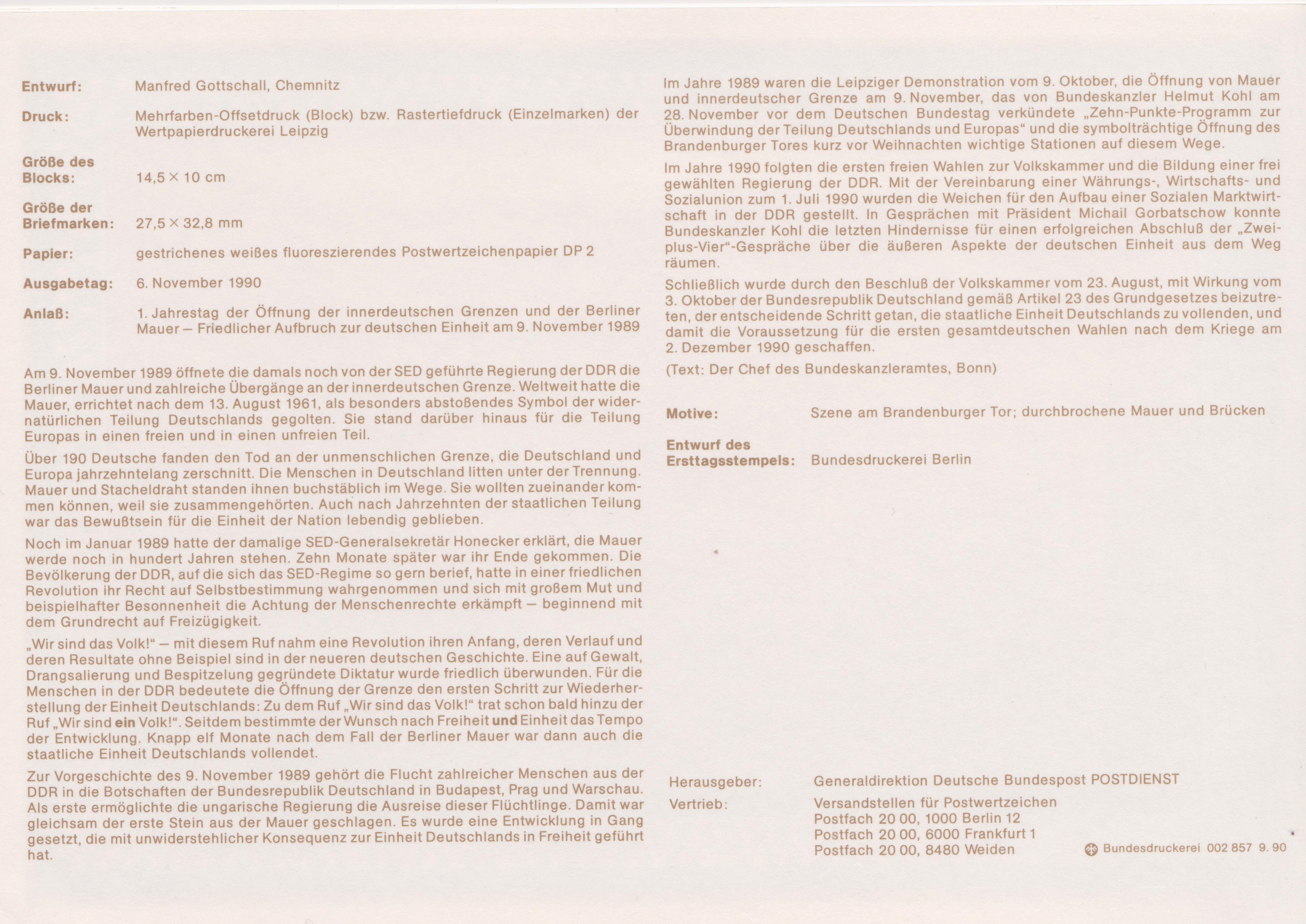 Den Anfang macht dieses "ESTTAGSPLATT 29/1990" (= ETB) der Bundesrepublik Deutschland zum Thema "Erster Jahrestag der Öffnung der innerdeutschen Grenzen und der Berliner Mauer".