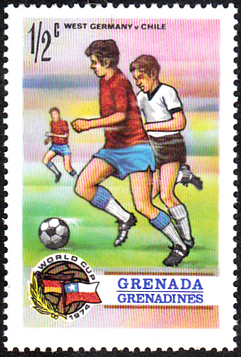 Hier eine Marke (MiNr 17) aus einer Serie aus Grenada/Grenadinen vom 17.9.1974 zur Fußball-WM 1974. Das Markenbild ist dem Spiel Bundesrepublik Deutschland - Chile (1:0) aus der Vorrundengruppe A am 14. Juni 1974 in Berlin gewidmet.