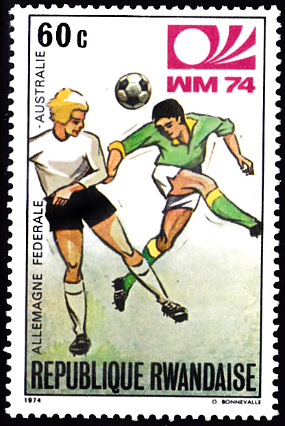 Am 18. Juni 1974 spielten in Hamburg (Volksparkstadion ) in der Gruppe I Australien – BR Deutschland 0:3. Eine Marke aus Ruanda (MiNr 628 A) belegt dieses Spiel.