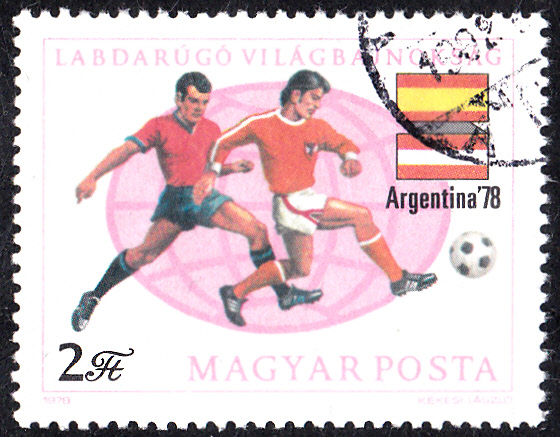 In Ungarn erschien zur WM 1978 eine Serie von Marken, die den ersten Gruppenspielen der WM 1978 gewidmet sind. Hier die Marke (MiNr 3284 A) zum Eröffnungsspiel in der Gruppe 2 Deutschland - Argentinien am 1. Juni 1978 in Buenos Aires, das 0:0 endete.