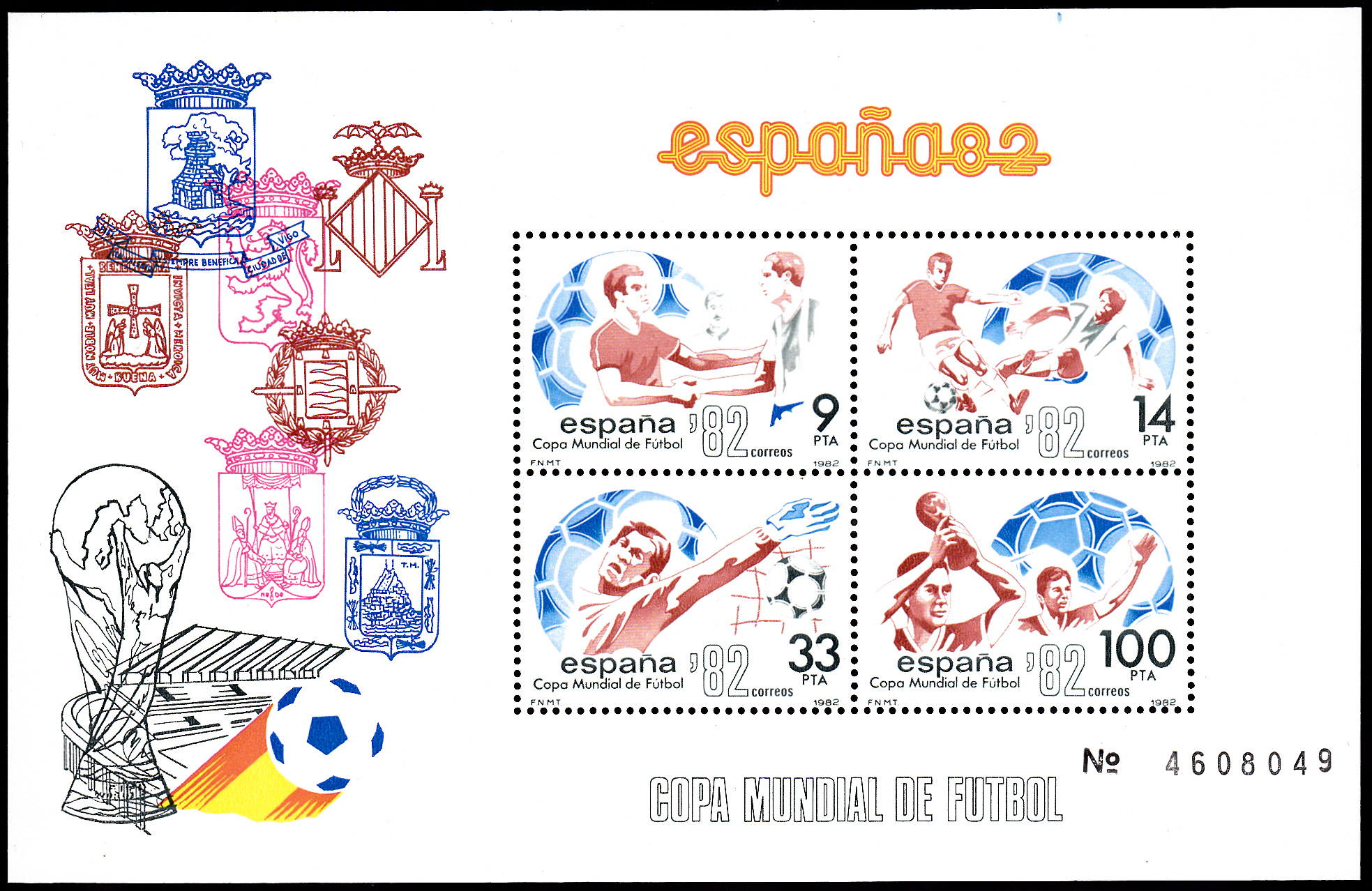 Ergänzend zu den in einem Beitrag auf der zweiten Seite hier gezeigten Marken und Blocks aus Spanien zu der WM 1982 zeige ich hier ergänzend auch noch den zweiten Block (MiNr Block 26), der zwar die gleichen Marken wie der bereits gezeigte Block MiNr Block 25 enthält, er hat jedoch auf dem Blockrand andere Wappen.