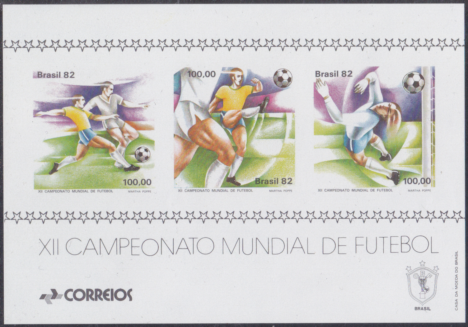 Auf einer weiteren Marke (MiNr 1126) werden ein Spieler, die Flagge Brasiliens und ein Teil eines Fußballs gezeigt.