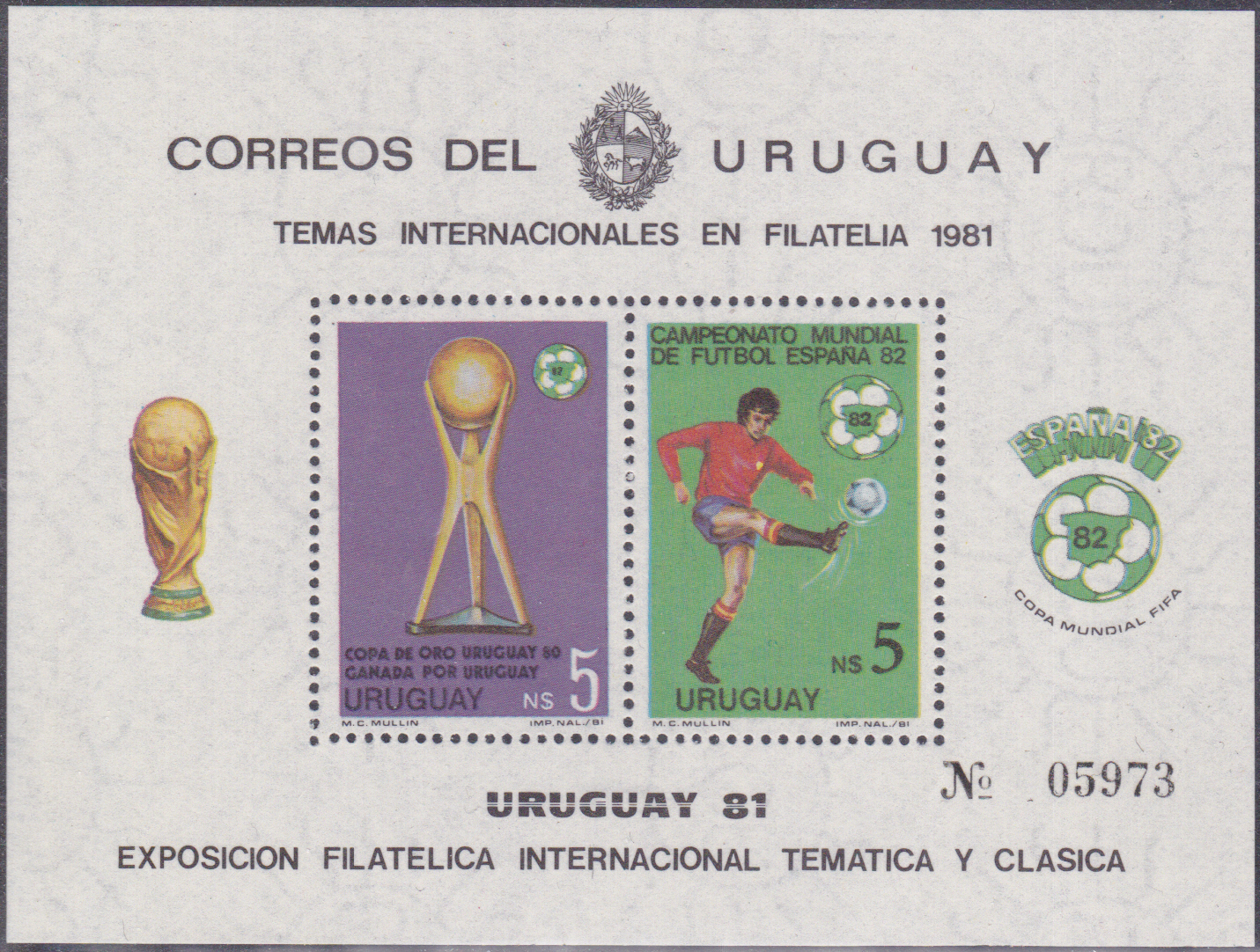 Zur Ausgabe gehört auch ein Block (MiNr Block 100 mit Marke MiNr 1128). Auf der Marke ist der Jules-Rimet-Pokal (war von 1930 bis 1970 die Siegestrophäe der Fußball-Weltmeisterschaften) und das offizielle Maskottchen des Turniers.