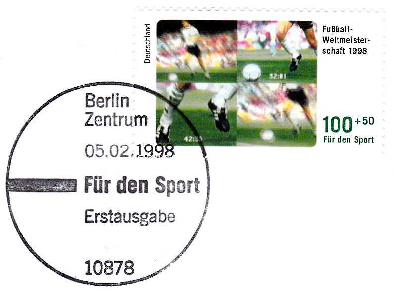 Zur Fußball-WM 1998 erschien bei der Deutschen Post am 5.2.1998 in der Serie "Für den Sport" eine Zuschlagsmarke (MiNr 1968). Auf dieser Postkarte ist die Marke mit einem Sonderstempel aus Mühlheim vom 10.6.1998, der am Eröffnungstag auf diese WM mit einem Fußballmotiv hinweist, gestempelt.