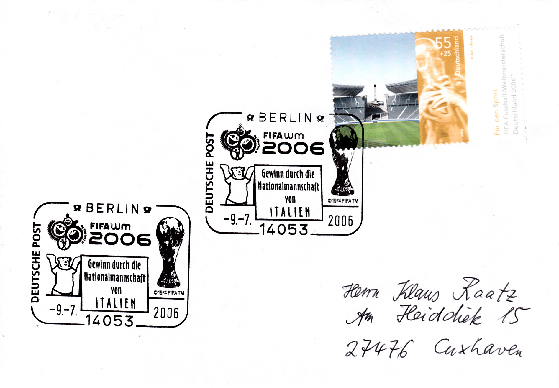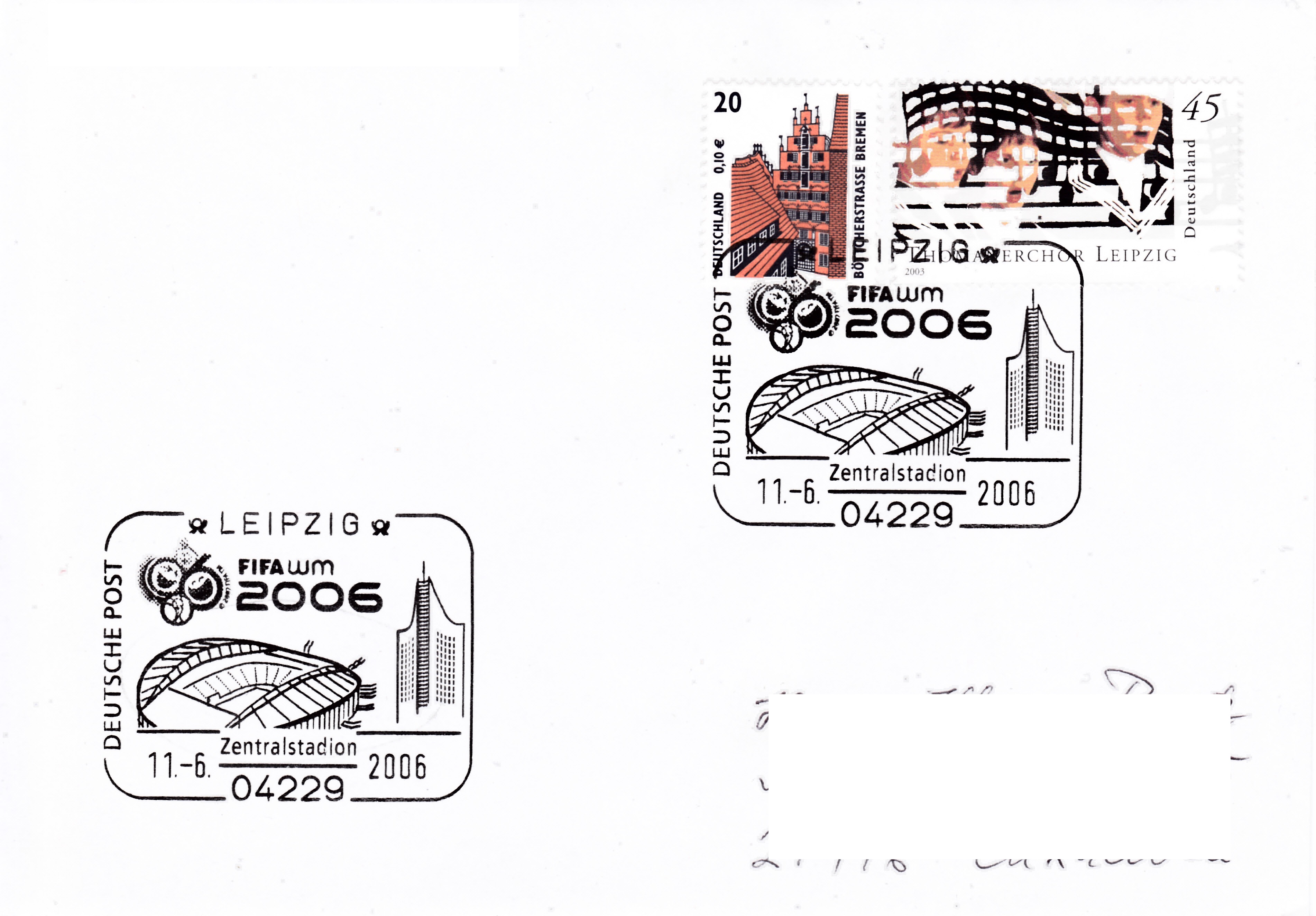Gelaufener Brief mit dem Sonderstempel vom 11.6.2006 aus Leipzig. Er dokumentiert das Spiel Serbien und Montenegro – Niederlande und zeigt das FIFA WM-Stadion Leipzig (das Heimatstadion von RB Leipzig, Red Bull Arena, bis 30. Juni 2010 offiziell und im Sprachgebrauch auch heute noch Zentralstadion).