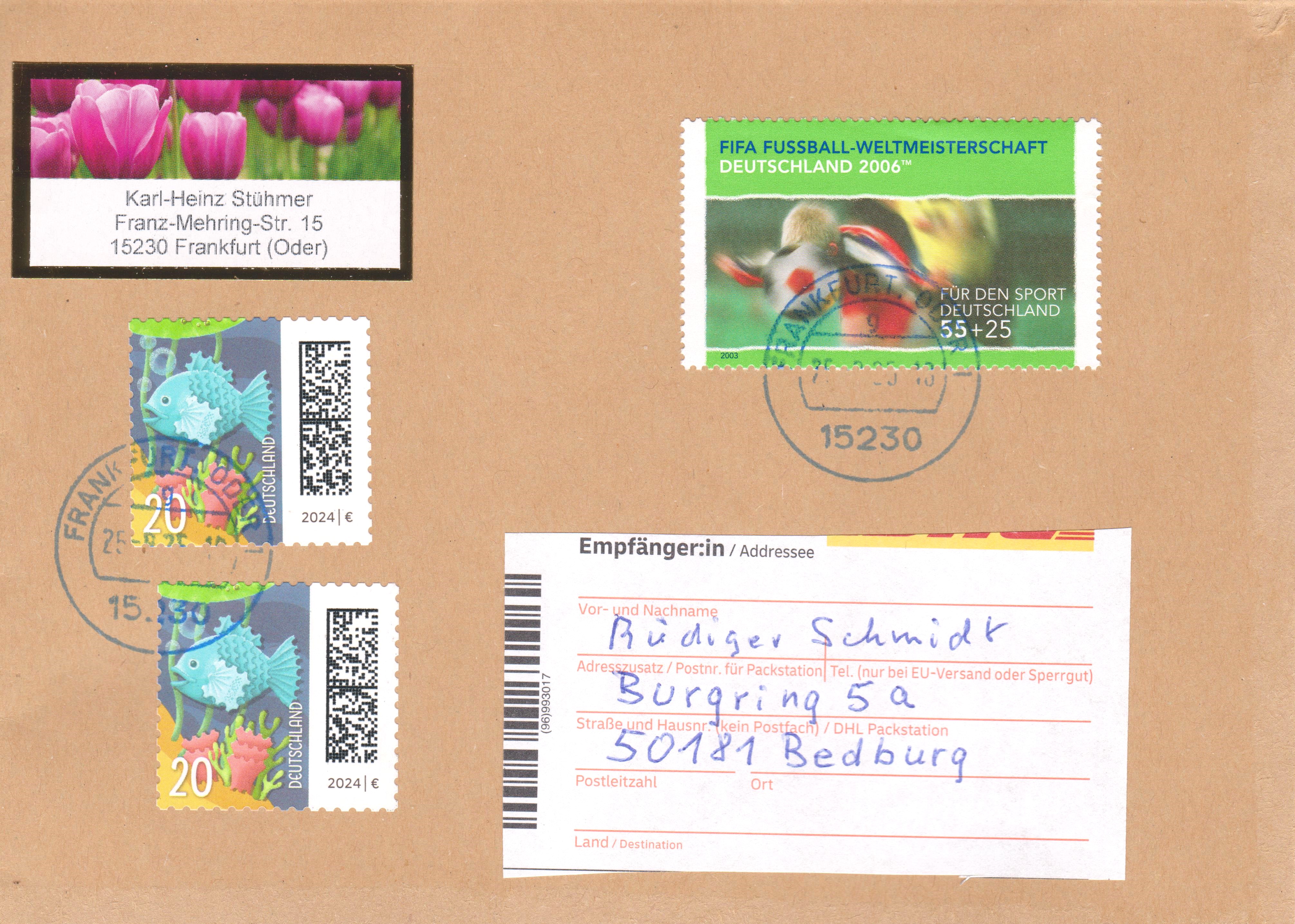 Einschreibebrief nach Österreich frankiert mit der Marke zu 55+25 Cent (MiNr 2518) zur WM 2006 mit der Abbildung der Allianz-Arena München und einer Marke zu 2,20€ der DS "Sehenswürdigkeiten" (MiNr 2307). Die Marke zur WM 2006 wurde mit dem Ersttagsonderstempel aus Berlin gestempelt, die Zusatzfrankatur mit einem Tagesstempel der Stempelstelle Berlin. In Österreich erhielt der Brief noch einen gelben "R-Zettel".