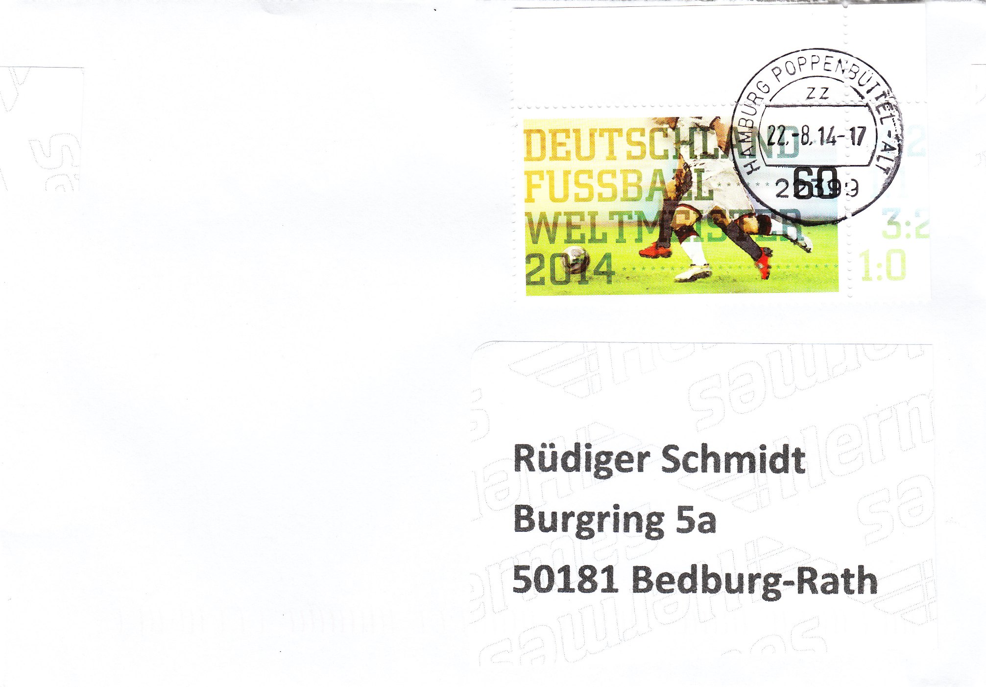 Die am 17.07.2014 verausgabte Sondermarke zum Gewinn der Fußball-Weltmeisterschaft durch die Deutsche Mannschaft erschien wie üblich im Zehnerbogen. Auf dem Bogenrand sind verschiedene Ergebnismöglichkeiten abgedruckt. Bei der WM waren aber nicht alle der zu sehenden Ergebnisse erzielt worden und umgekehrt sind aber auch nicht alle erzielten Ergebnisse auf dem Bogenrand zu sehen.