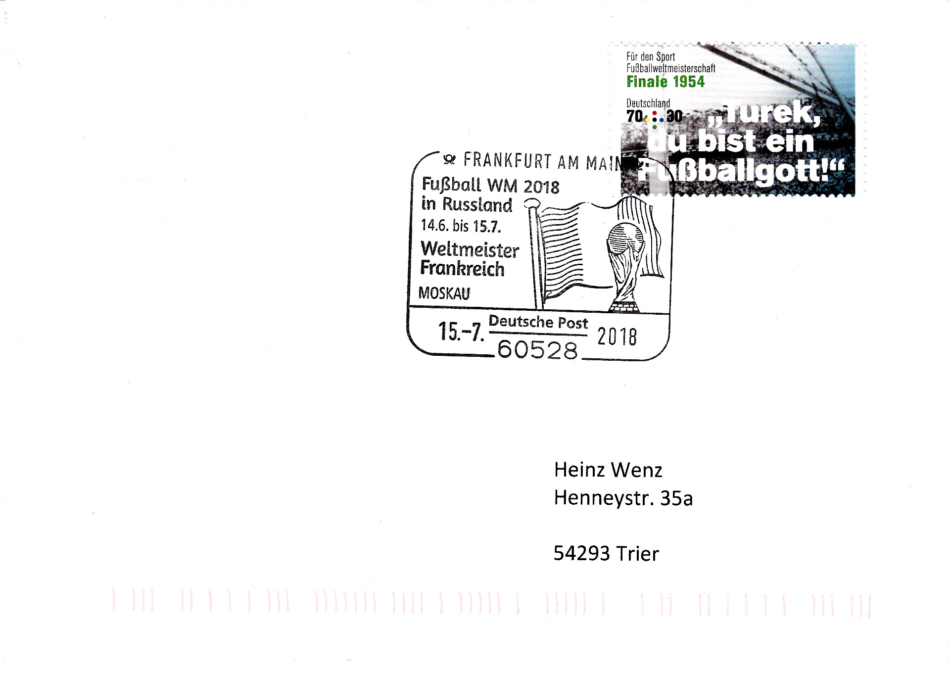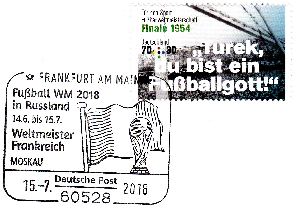 Das Endspiel zwischen Kroatien und Frankreich fand am 15.7.2018 in Moskau statt. Dazu wurde in Frankfurt dieser Sonderstempel geführt.