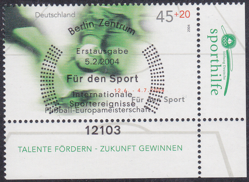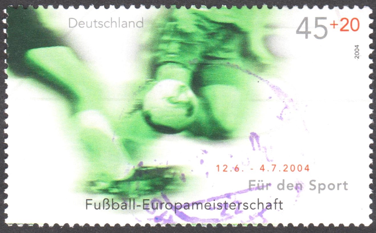 Bedarfsgestempelte 45+25 Cent-Marke "Fußball-Europameisterschaft", MiNr. 2382, aus der Serie für die Sporthilfe 2004:
