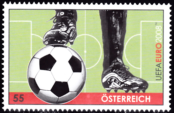 Diese Marke (MiNr 2723) aus Österreich zur Fußball-EM 2008 zeigt Spielerbeine mit einem Fußball und im Hintergrund ein Spielfeld.