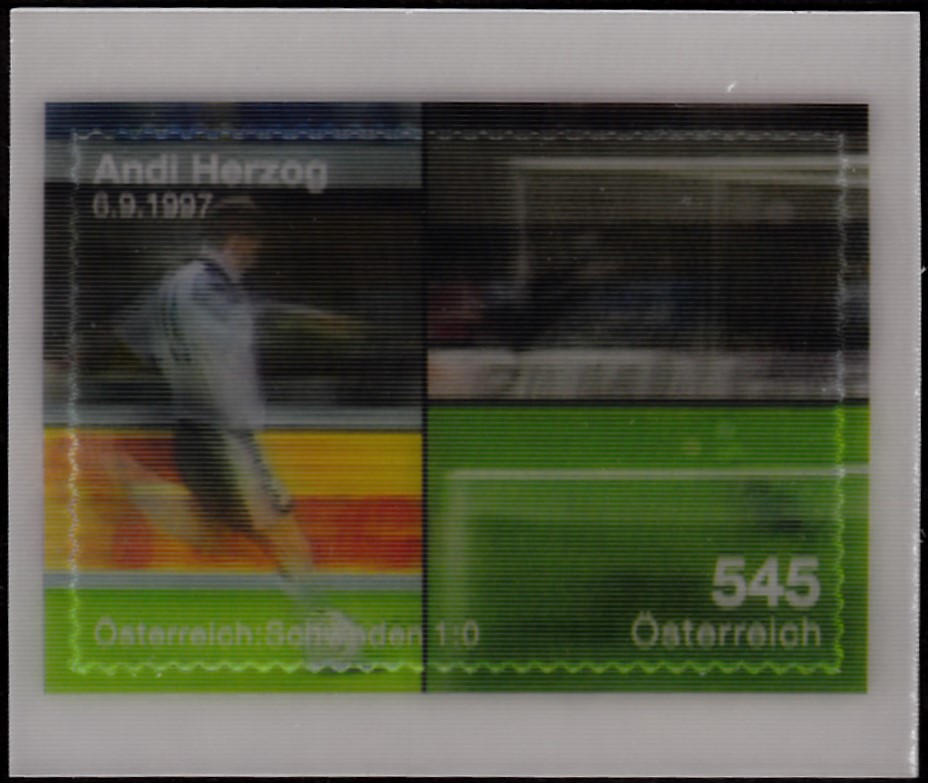 Diese Blockausgabe aus Österreich (MiNr Block 42 mit Marke MiNr 2731) zur Fußball-Europameisterschaft in Österreich und der Schweiz ist mit einem mit geriffeltem Kunststoffüberzug überzogen ("Wackelbild"). Er zeigt Andreas Herzog beim Torschuss zum 1:0-Sieg im WM-Qualifikationsspiel gegen Schweden im Jahre 1997.