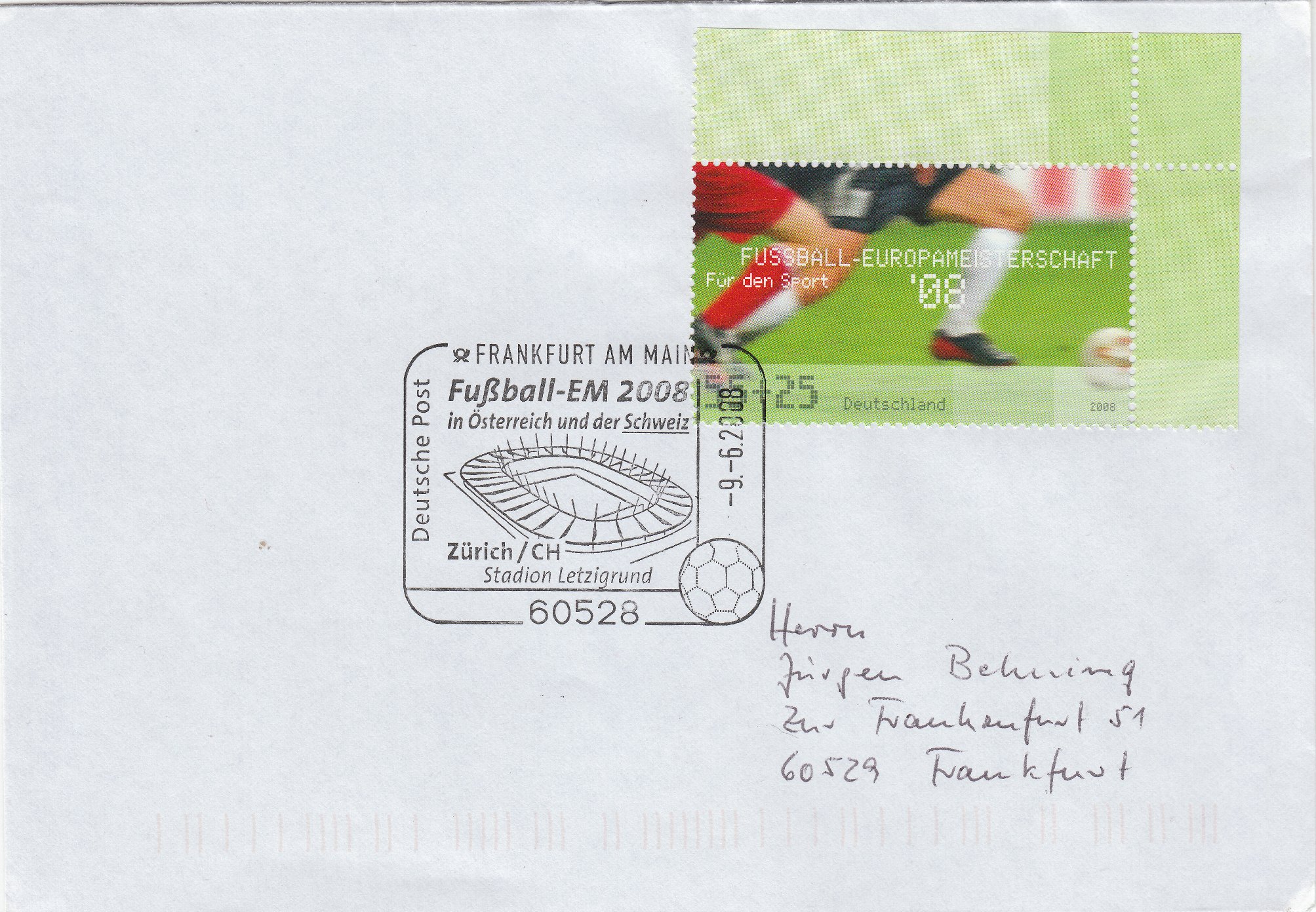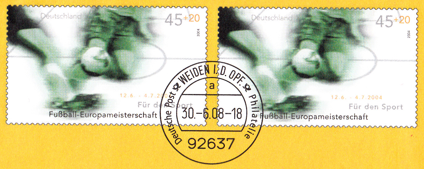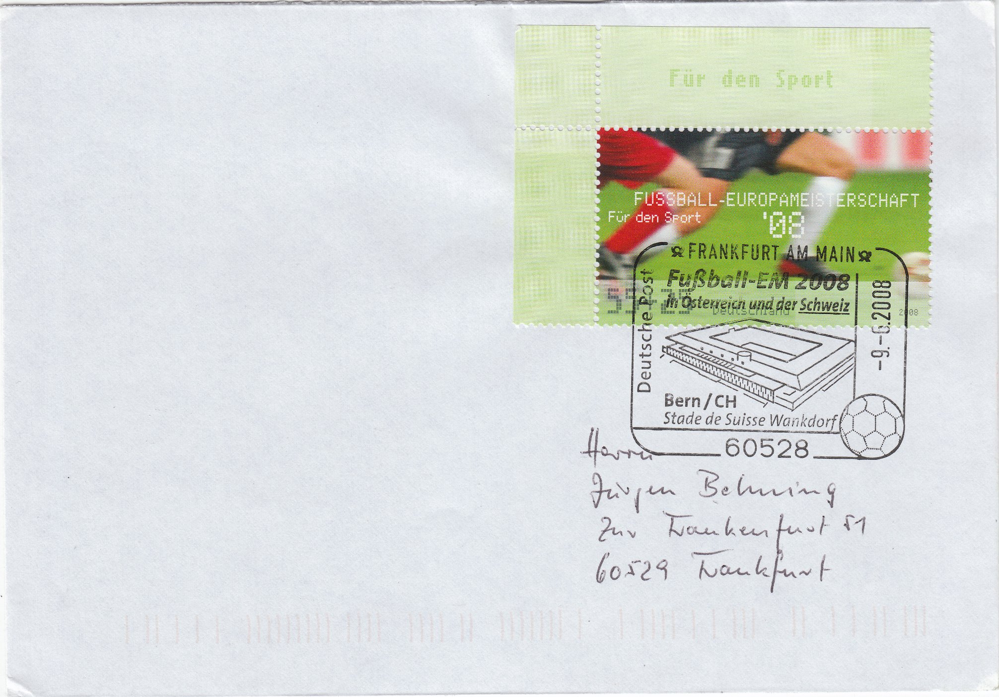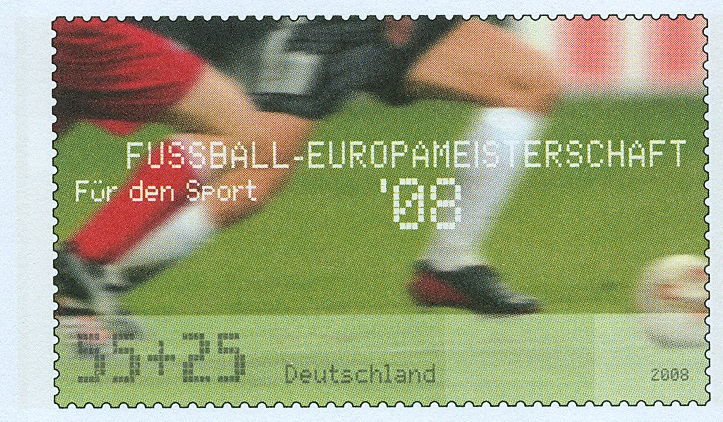 Dieser Sonderstempel aus Frankfurt dokumentiert dieses sportliche Ereignis auf der zur EM 2008 in Deutschland erschienenen Zuschlagsmarke: