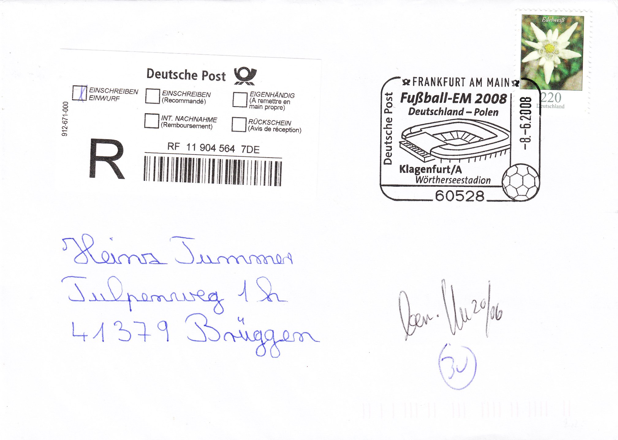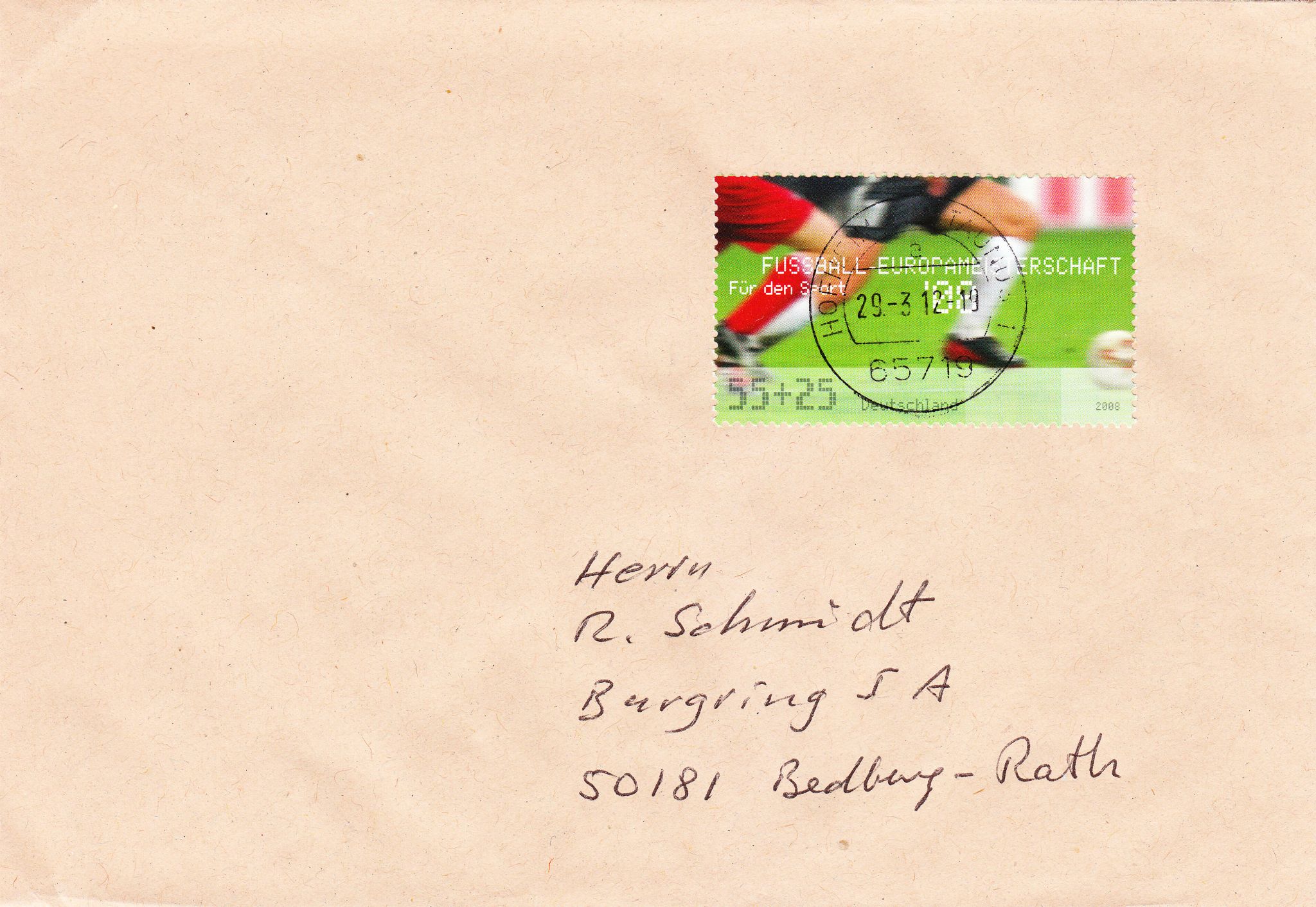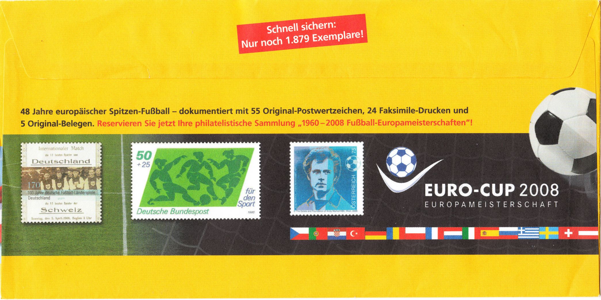 Dieser Sonderstempel aus Frankfurt dokumentiert dieses sportliche Ereignis auf der zur EM 2008 in Deutschland erschienenen Zuschlagsmarke: