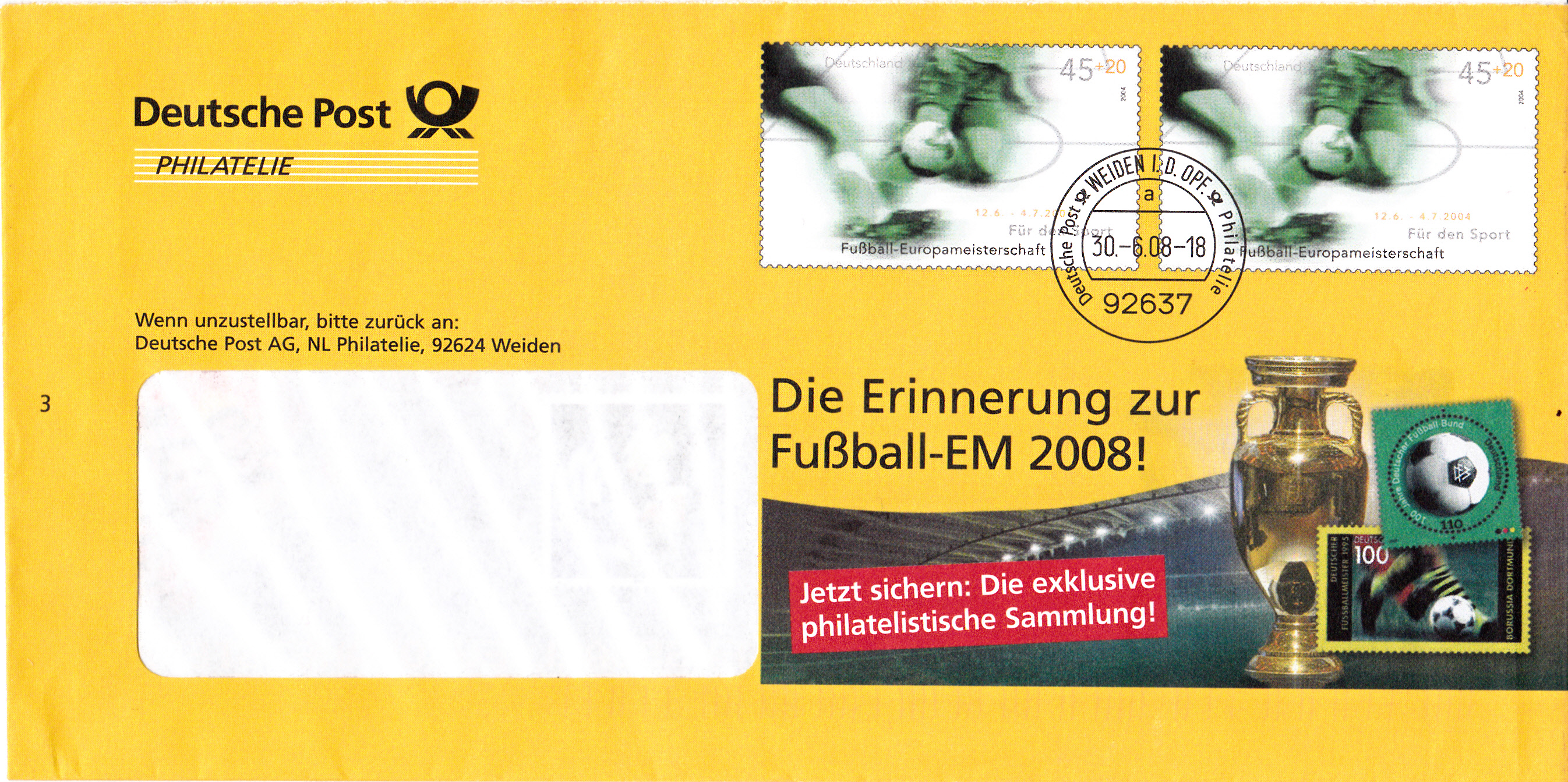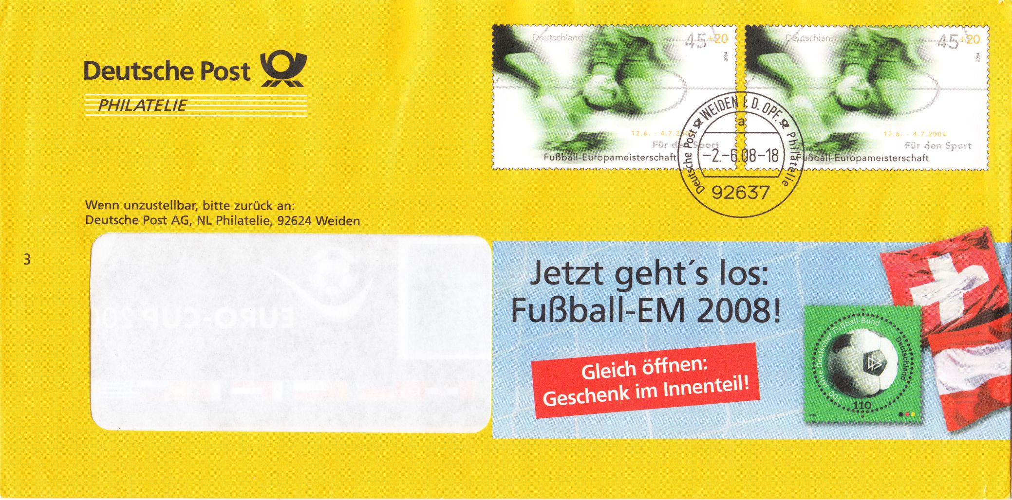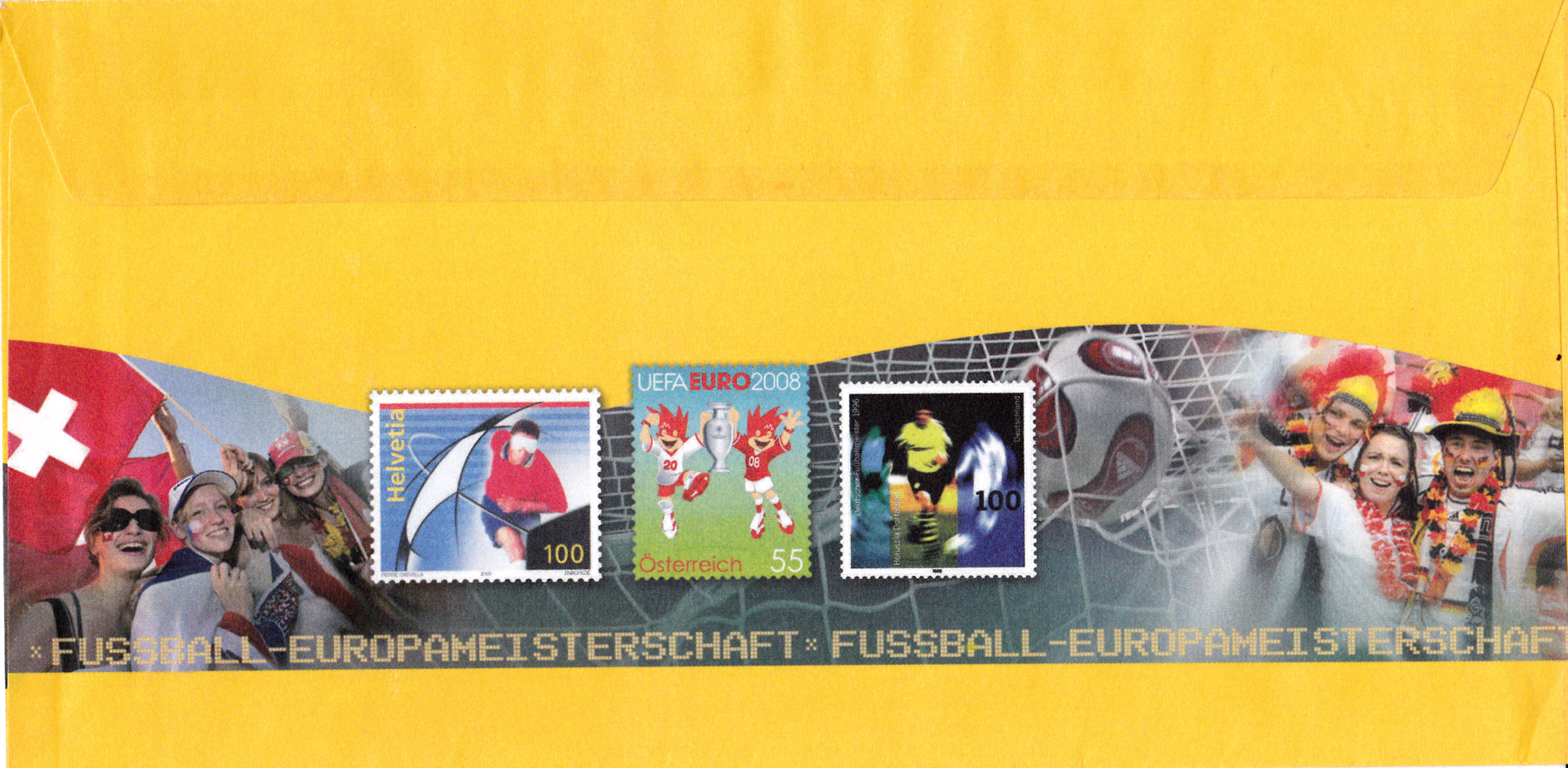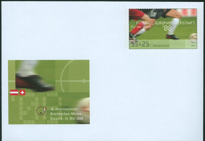 Ganzsachenumschlag im Format 229 x 114 mm (MiNr EA F333) mit zwei Wertstempel der 45+25 Cent Marke "Sporthilfe" 2004 (MiNr 2382) zur Erinnerung an die Fußball EM 2008. Rückseitig ist auch je eine Marke aus der Schweiz und aus Österreich zur EM 2008 abgebildet.