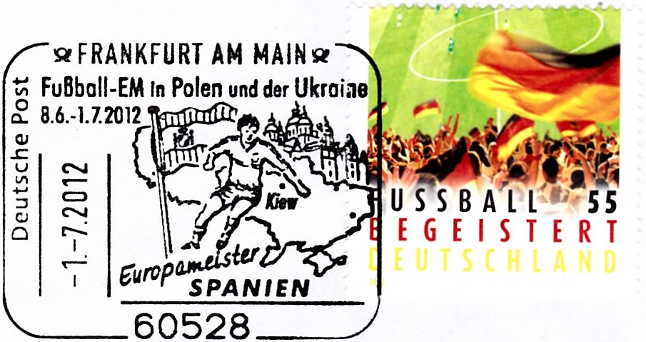 Zum Gewinn der Fußball-Europameisterschaft in Polen und der Ukraine durch die spanische Nationalmannschaft ist in Spanien ein Block (MiNr Block 230 mit Marke MiNr 4739) erschienen. Die Marke zeigt den EM-Pokal, auf dem Block sehen wir die Spanische Nationalmannschaft.