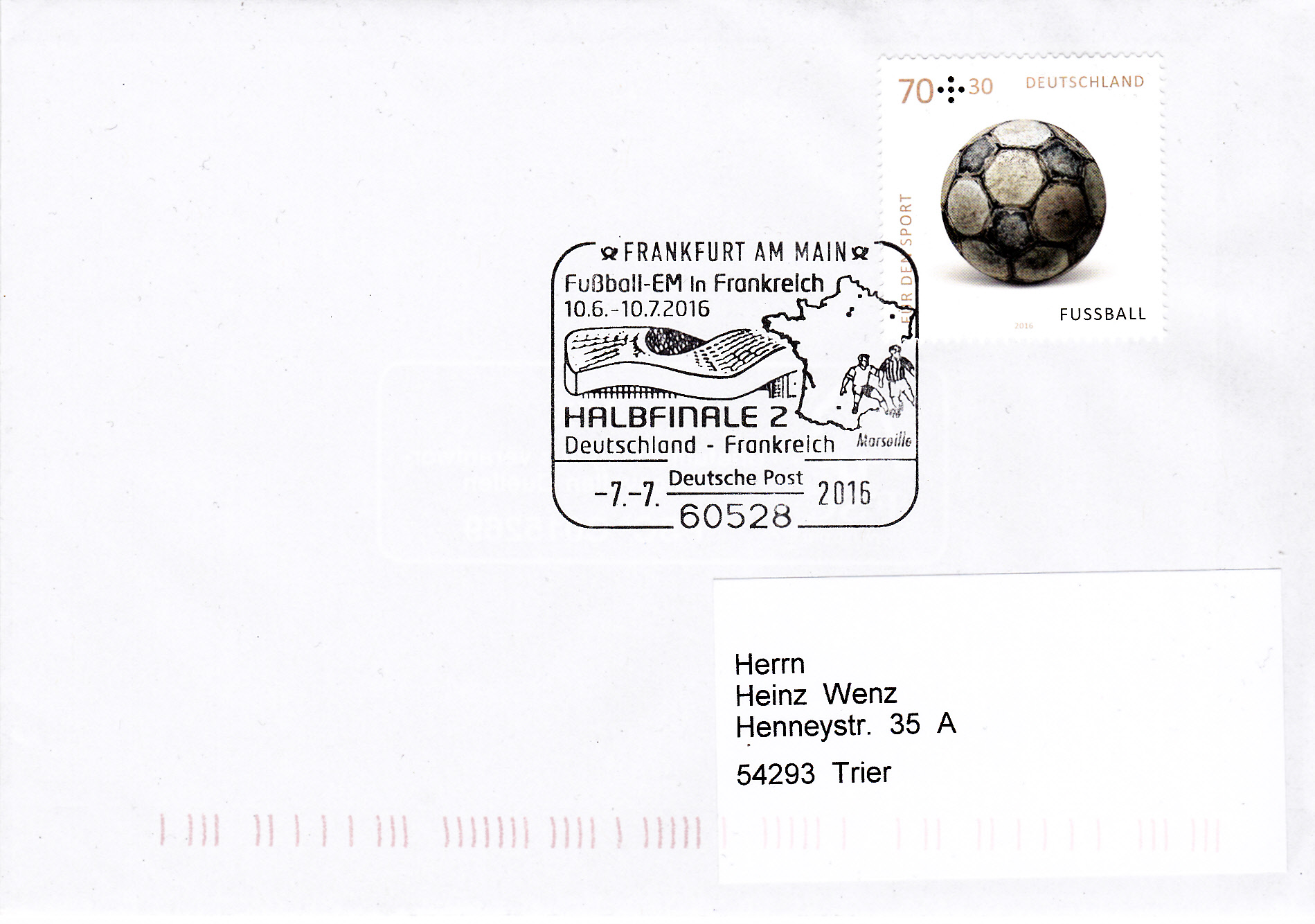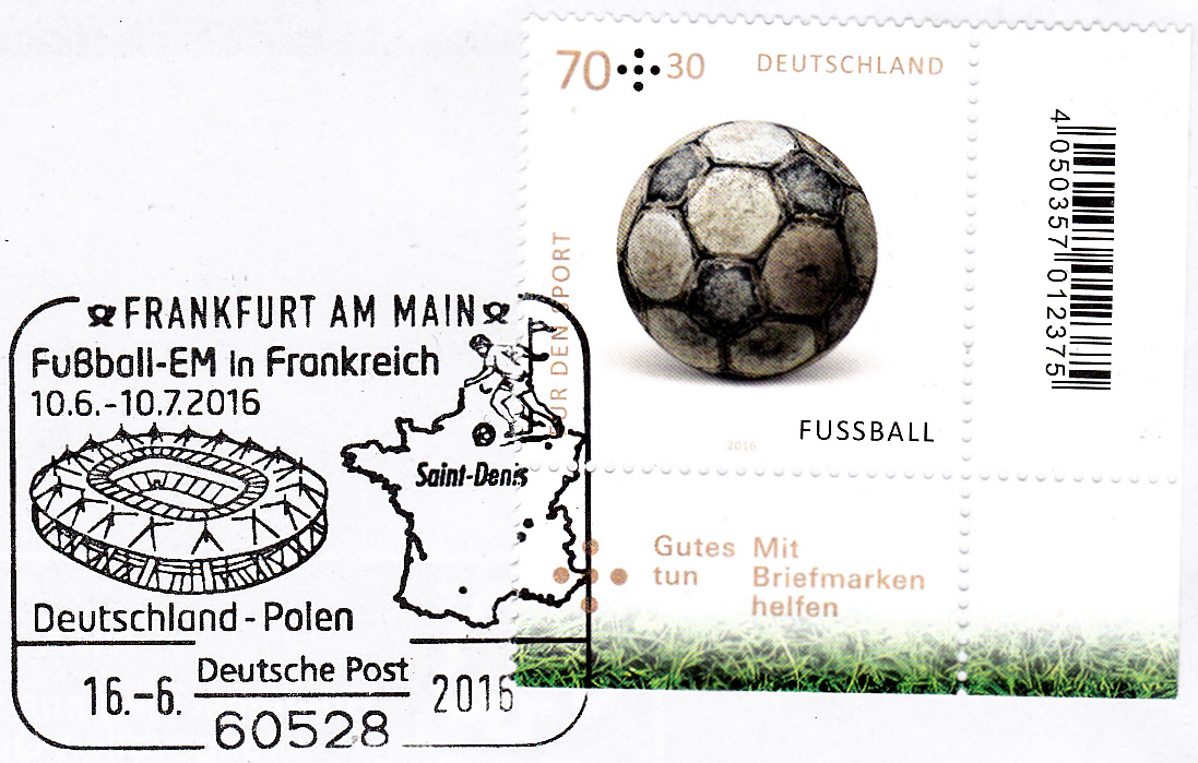 Am 16.6.2016 spielte die deutsche Mannschaft in Saint-Denis gegen Polen. Das Spiel endete 0:0. In Frankfurt am Main gab es zu diesem Spiel einen Sonderstempel. Im Stempelbild wird das Stadion in Saint-Denis und ein Länderumriss Frankreichs mit einem Fußballspieler gezeigt.