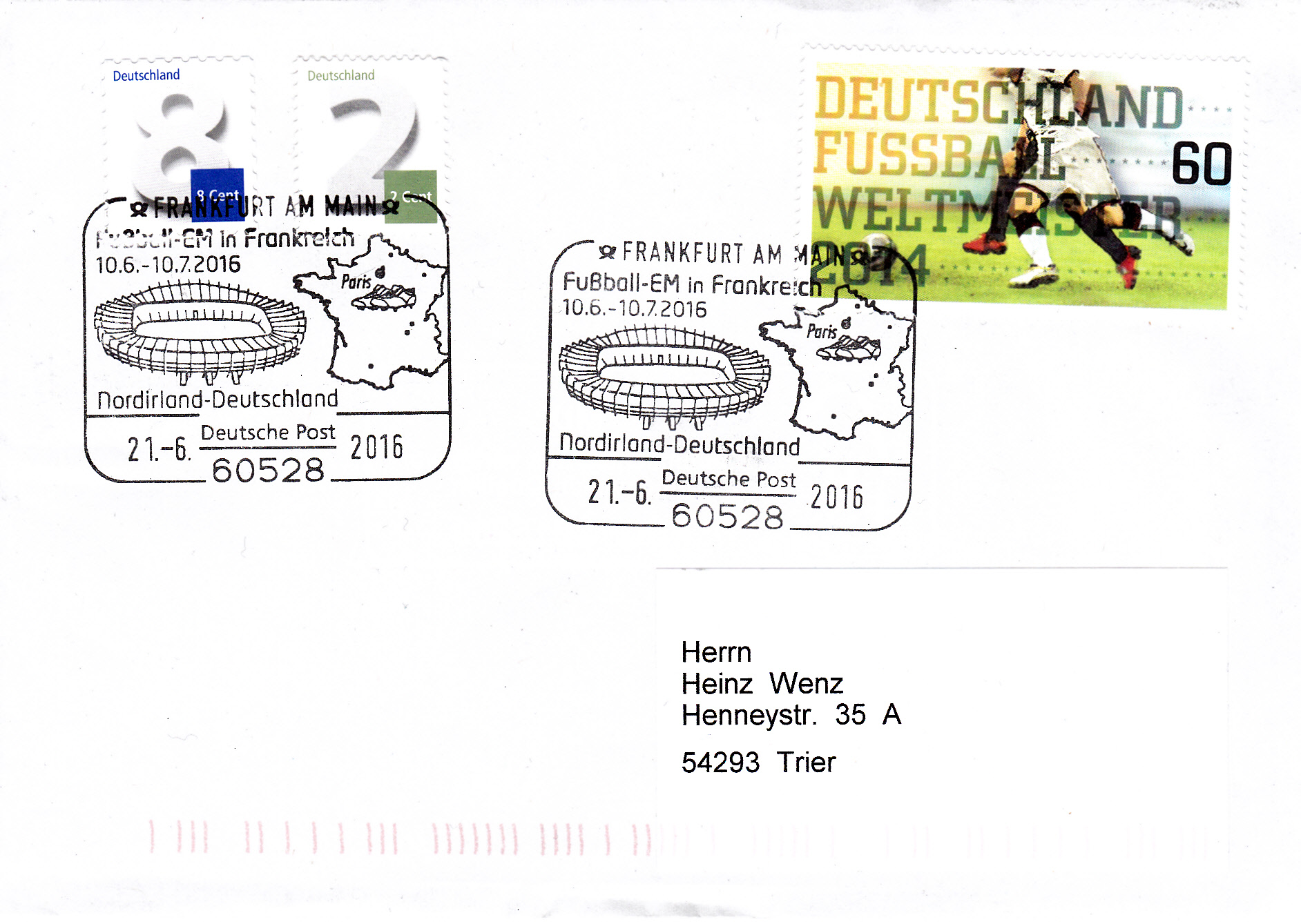 Am 21.6.2016 spielte die deutsche Mannschaft in Paris gegen Nordirland. Die deutsche Mannschaft gewann mit 1:0. In Frankfurt am Main gab es zu diesem Spiel einen Sonderstempel. Im Stempelbild wird das Stadion in Paris und ein Länderumriss Frankreichs mit Fußballschuhen gezeigt.