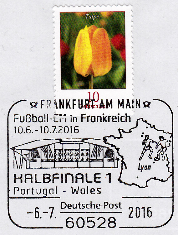 Im ersten Halbfinale standen sich am 6.7.2016 in Lyon Portugal und Wales gegenüber. Portugal siegte mit 2:0 und zog ins Finale ein. Sonderstempel aus Frankfurt vom 6.7.2016 zum Halbfinale in Lyon mit einer Abbildung des Stadions Parc Olympique Lyonnais, einem Länderumriss von Frankreich mit Spielorten der EM und zwei Fußballspieler.