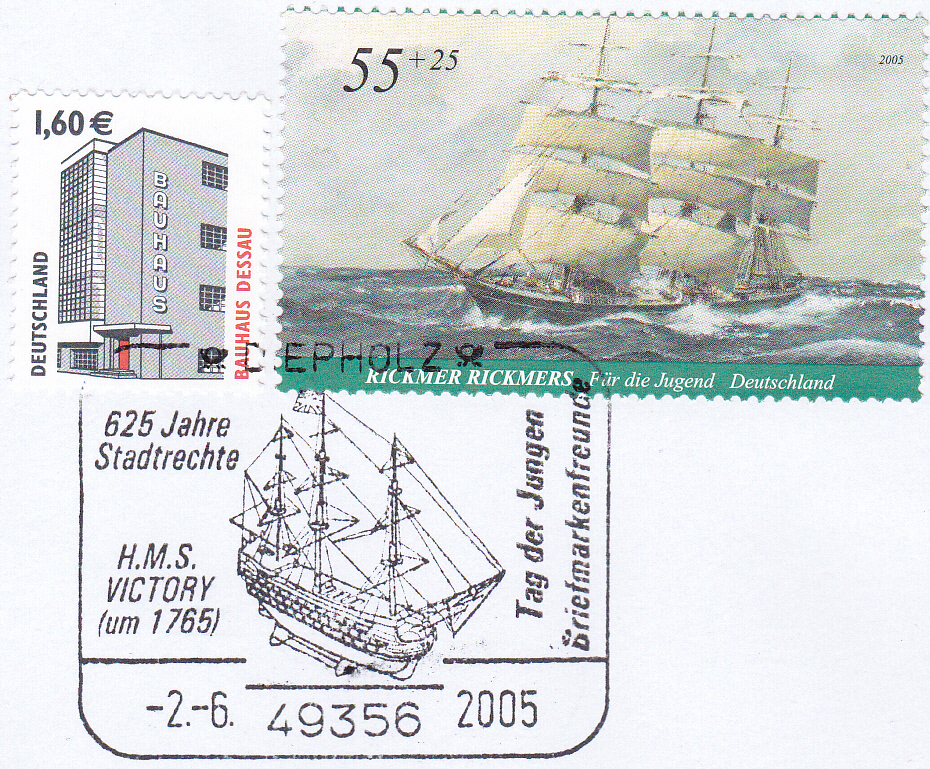 Die Marken auf diesem Einwurf-Einschreiben wurden mit einem Sonderstempel zum "Tag der Jungen Briefmarkenfreunde" 2005 aus Diepholz vom 2.6.2005 gestempelt. Im Stempelbild wird die H.M.S. Victory gezeigt. Der 2.6.2005 ist auch der Ersttag der Marke zu 55+25 Cent aus der Jugendmarkenserie 2005.