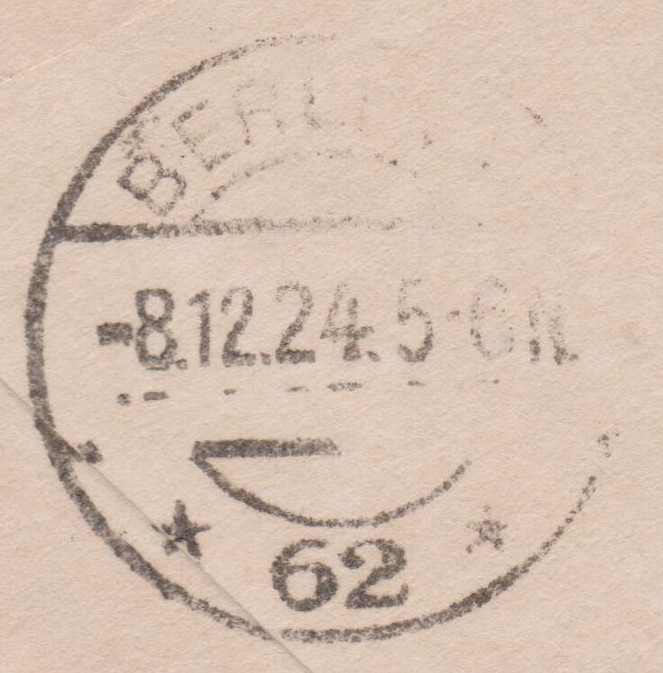 Laut rückseitig abgeschlagenem Ankunftstempel kam dieser Brief am 08.12.1924 nachmittags beim Bestimmungspostamt BERLIN W 62 an:
