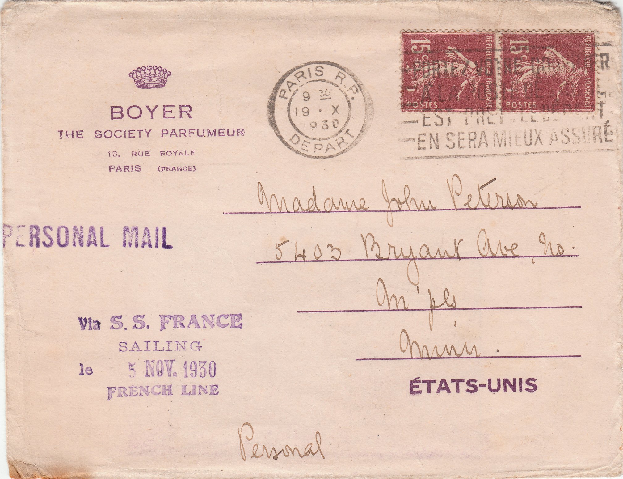 Dieser am 19.10.1930 in Paris aufgegebene Beleg machte sich laut Hinweisstempel am 05.11.1930 an Bord der S.S. FRANCE auf die Reise nach Minneapolis im US-Bundesstaat Minnesota: