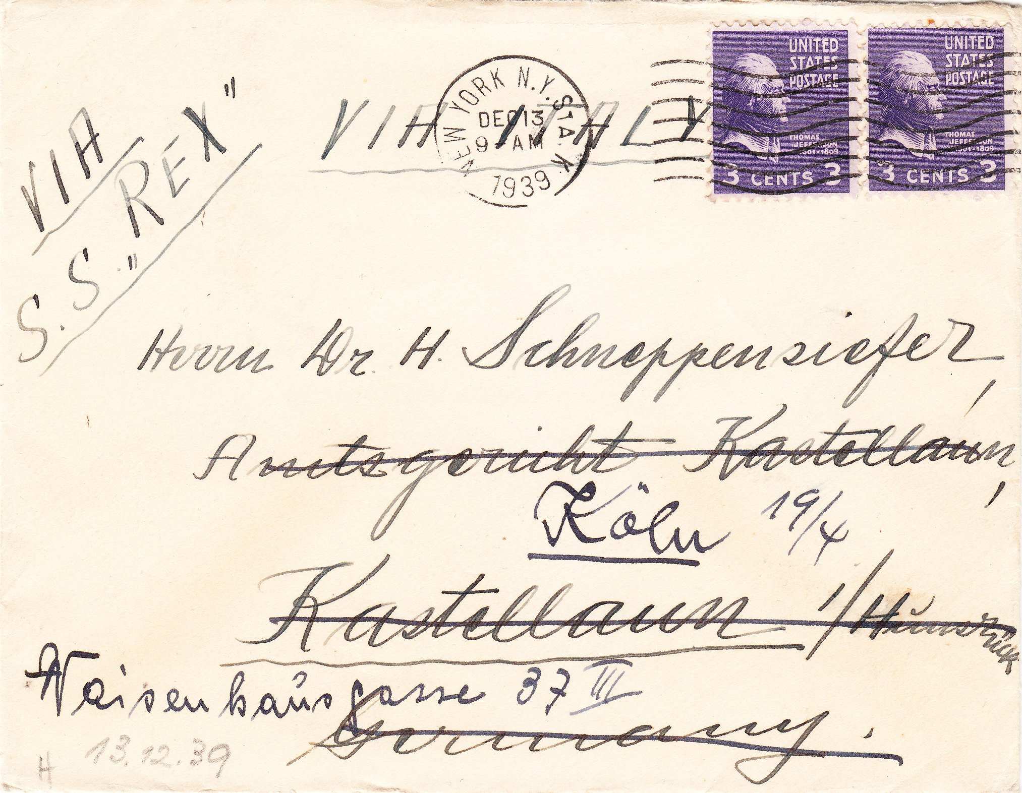 Dieser Beleg wurde am 13.12.1939 in New York aufgegeben und wurde "VIA SS "REX" und somit "VIA ITALY" befördert: