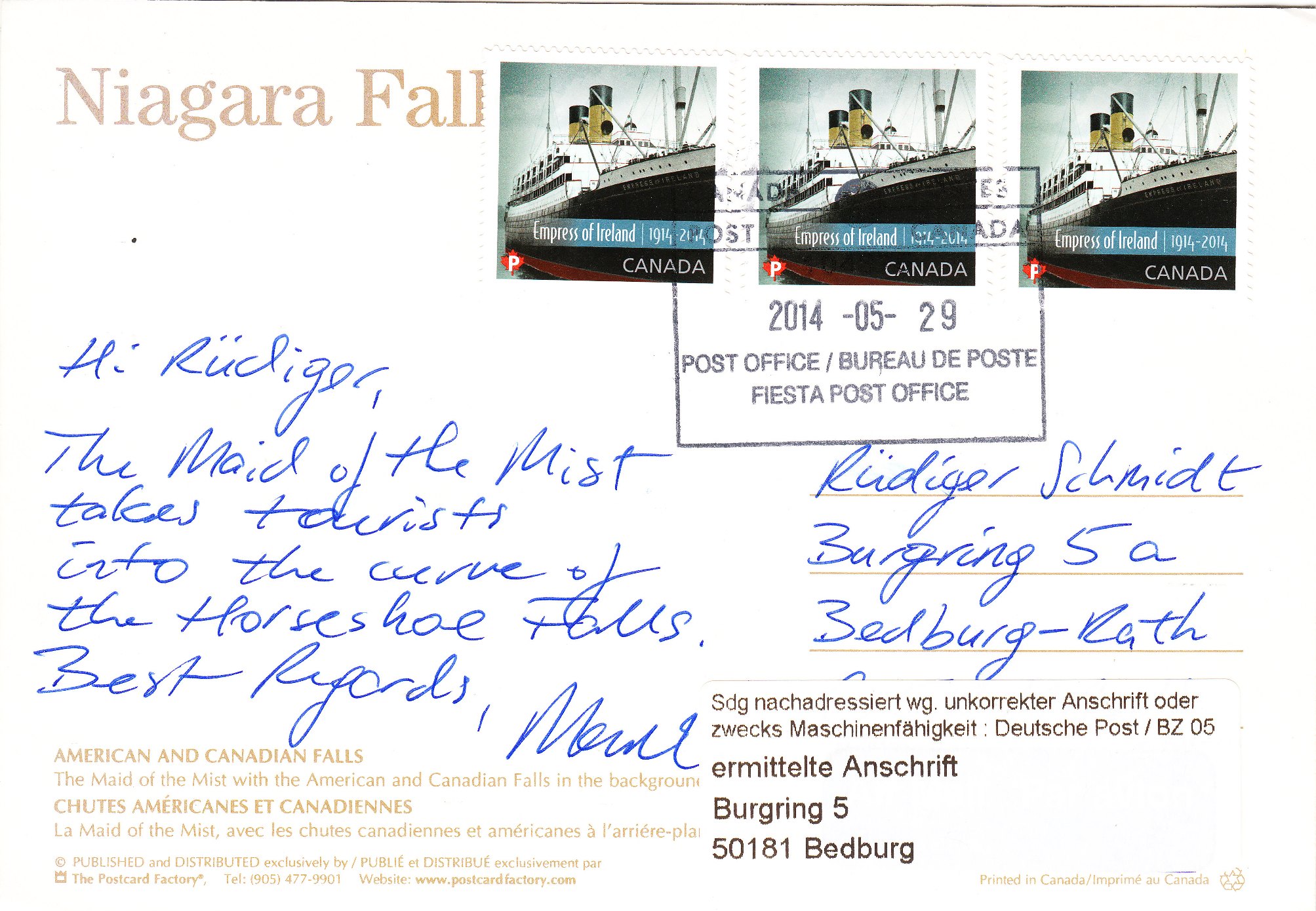 An dieses denkwürdige Ereignis erinnert diese gerade herausgegebene Sondermarke aus Canada, hier gleich als Mehrfachfrankatur von 3 Stück auf einer Postkarte nach Deutschland: