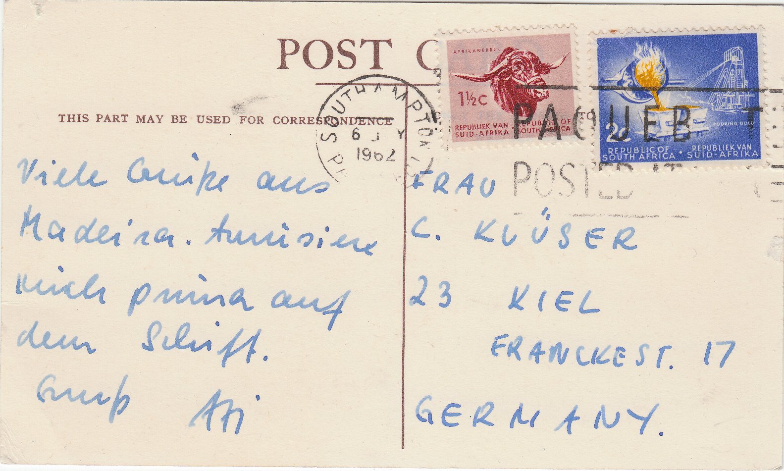 Diese Postkarte wurde auf der Rückreise von Südafrika nach Europa mit Marken aus Südafrika frankiert, an Bord des Schiffes laut Text auf Madeira geschrieben und zwischen Madeira und Southhampton an Bord aufgegeben, so daß die Frankatur am 06.07.1962 einen Entwertungsstempel