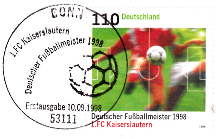 Der 1.FC Kaiserslautern wurde in der Saison 1997/98 Deutscher Fußballmeister. Bei der Deutschen Post erschien dazu eine Sondermarke (MiNr 2010). Hier zeige ich ein Eckrandpaar auf Brief mit Ersttagssonderstempel aus Berlin vom 10.9.1998. Zur Portostufe: ein Brief von 21 bis 50 Gramm kostete von 1.9.1997 bis 31.12.2001 220 Pfennig (hier 2 x 110 Pf).