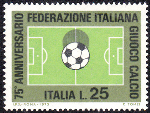 1973 erschienen in Italien zwei Marken zum Jubiläum "75 Jahre italienischer Fußballverband". Hier die Marke zu 25 Lire (MiNr 1404) mit einem Fußball und einem Spielfeld im Markenbild.