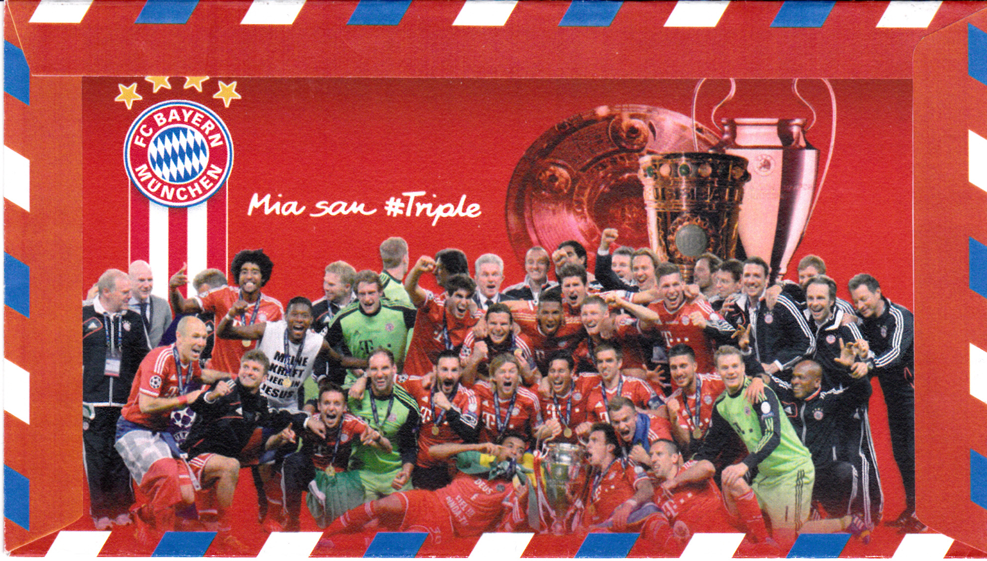 Hier ein mit einer WebStamp bedrucktes Auslands-Aerogramm eines Händlers aus der Schweiz für Aerogramme. Die Werbefläche der WebStamp hat er für Werbung für seine Firma benutzt. Dazu kommt ein privater Zudruck auf dem Aerogramm zum 2:1-Sieg des FC Bayern München gegen Borussia Dortmund beim Champions League Endspiel im Wembley Stadion.