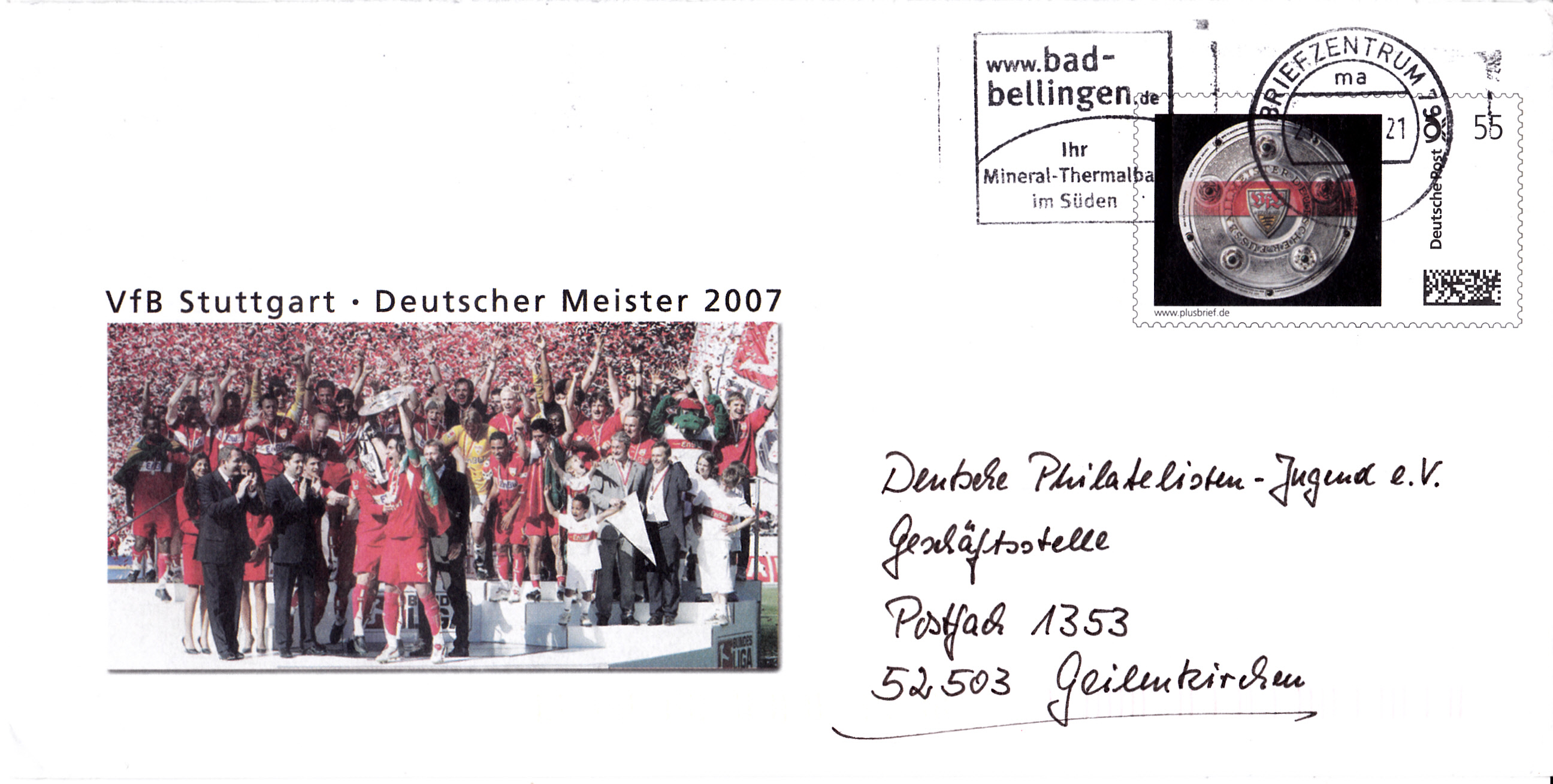 Zur Briefmarkenbörse Sindelfingen '97 ist eine Sonderpostkarte (MiNr PSo 50)erschienen, die den Pokalsieg 1997 des VFB Stuttgart würdigt. Die gezeigte Karte wurde als Stempelvorlage für einen Sonderstempel aus Suhl verwerndet.