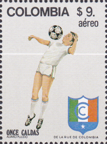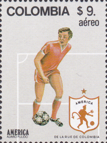 Zu den Fußballweltmeisterschaftenn1982 in Spanien ist in Kolumbien diese Marke (MiNr 1562) mit einem Spieler und dem Wappen von América de Cali erschienen.